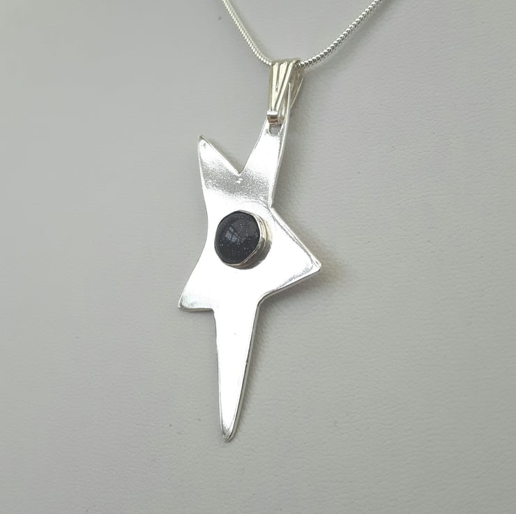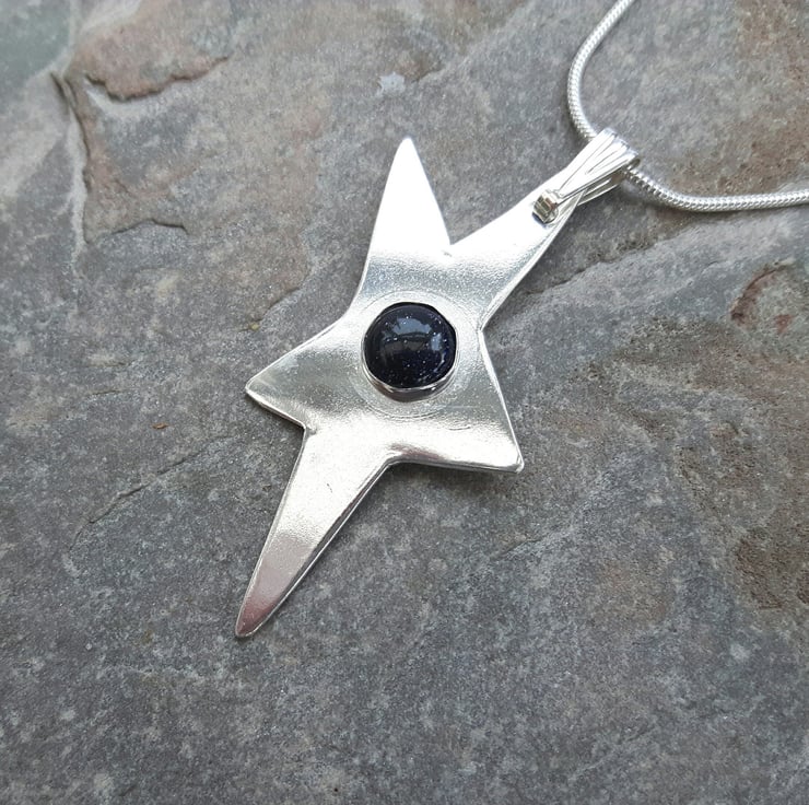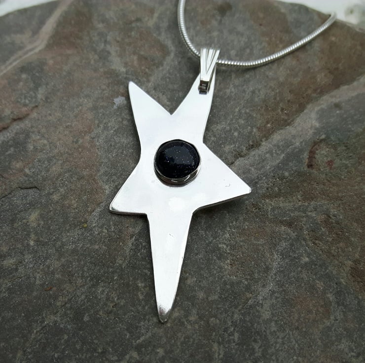 This lovely pendant has been cut by hand from Sterling silver sheet to create an elongated star shape. I have added a cabochon of blue goldstone - a deep midnight blue with tiny twinkling inclusions like stars in the night sky. This pendant is designed for stargazers. It would make a lovely seasonal gift at Christmas or indeed at any other time. It is suspended by means of a fluted sterling silver bail from a 45cm (18in) silver snake chain. The stone is 8mm in diameter and the star measures 5.5 x 2.5cm and weighs 4.9g. It has been polished to a high shine on both sides.