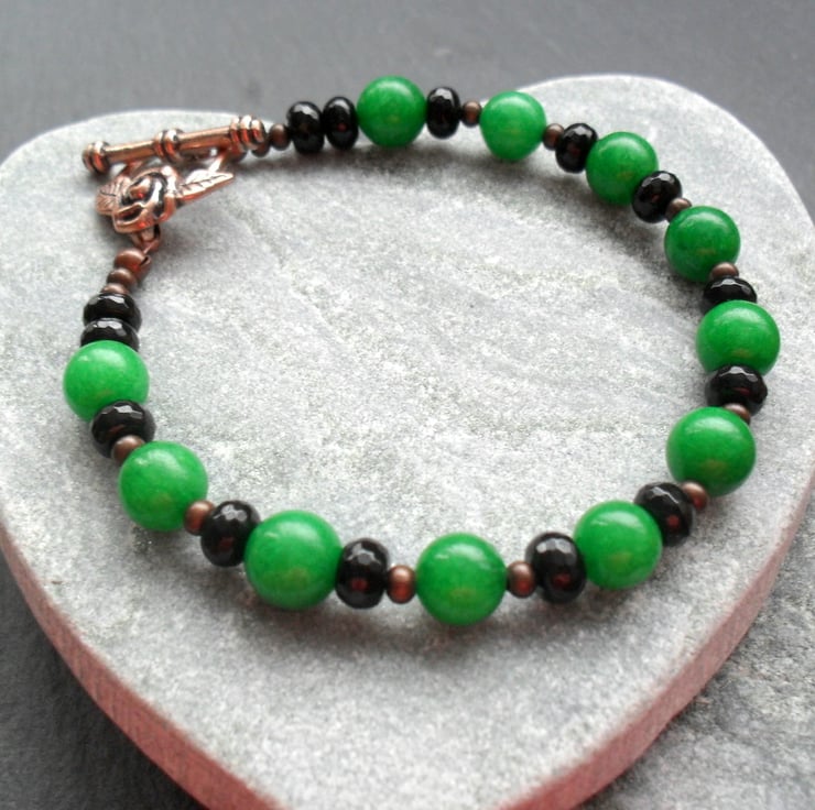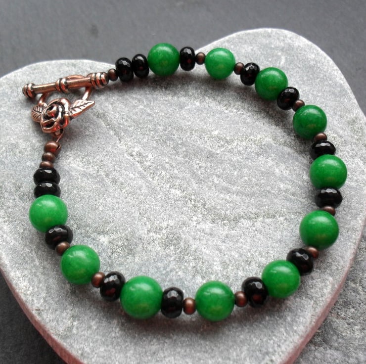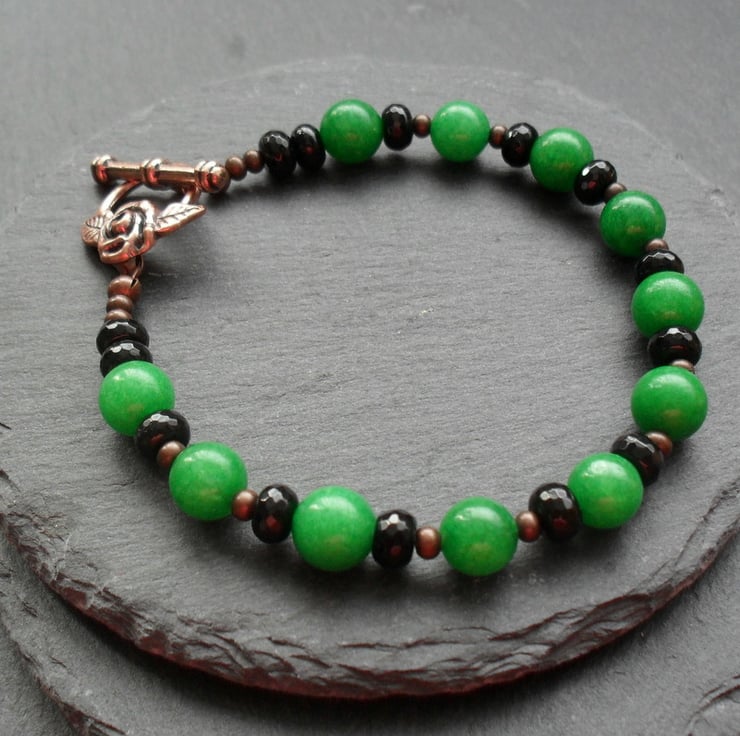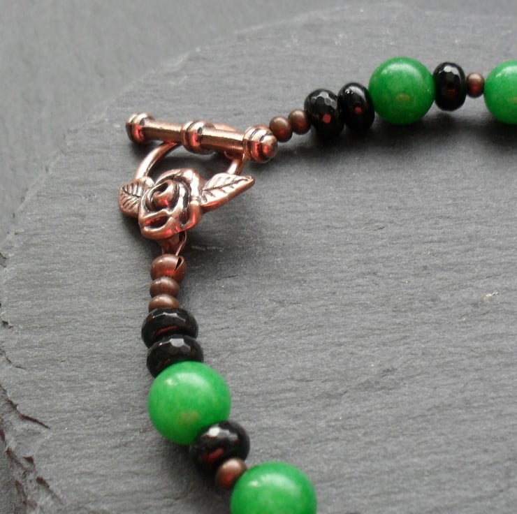 Bracelet with dyed green quartzite, black agate faceted beads and antique copper tone metal beads.