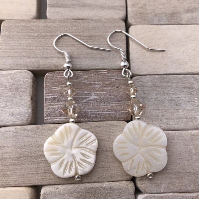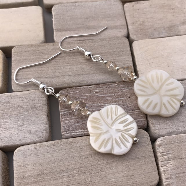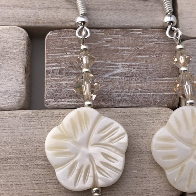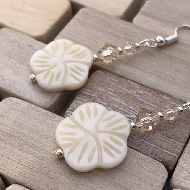 Each earring features an 18mm white shell flower that has had extra detail carved into each side. I have also added bicones, in an almost pale honey colour, to the top of the flowers to add a hint of sparkle and to compliment the shell flowers.