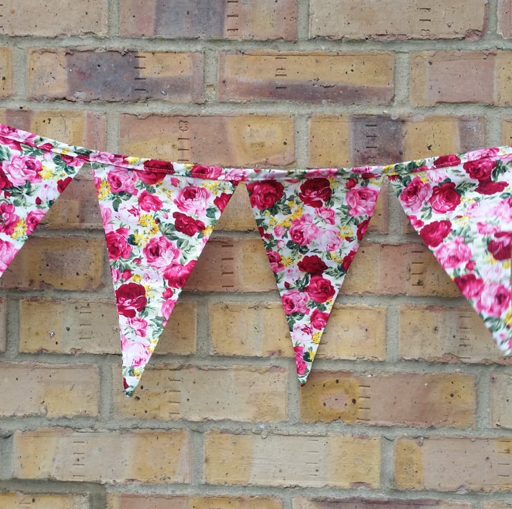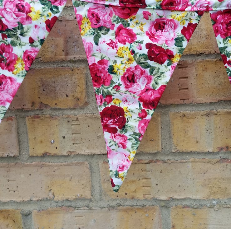 Bunting in pink roses fabric, tea party bunting. Free uk delivery.
