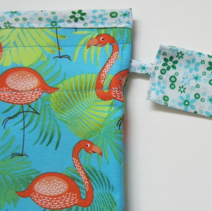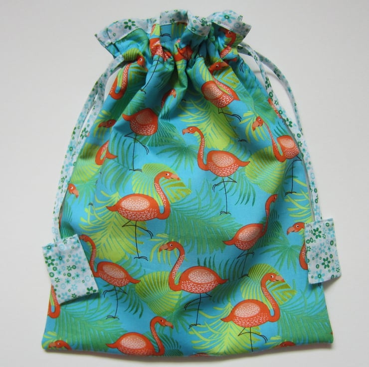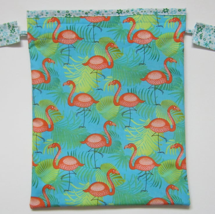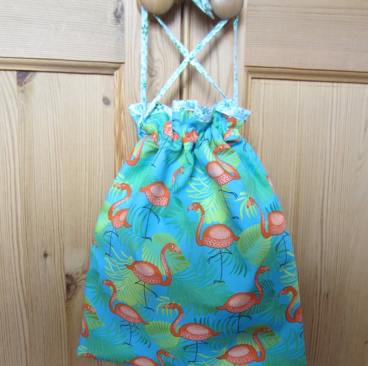 Drawstring bag in flamingo and leaves design on bright blue background. Lined with a strong showerproof lining and edged with a blue, green and white floral fabric. Pulls closed with matching tapes and tabs.