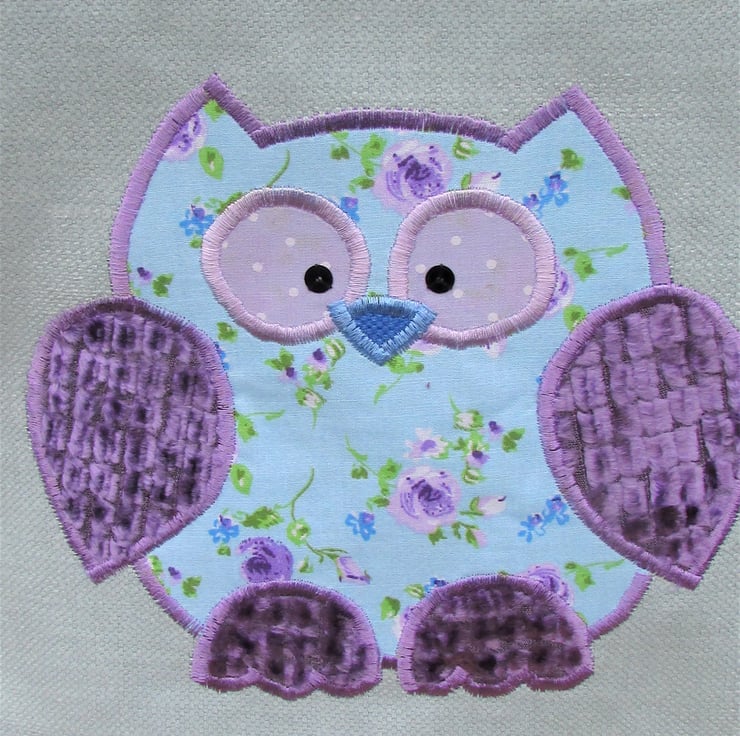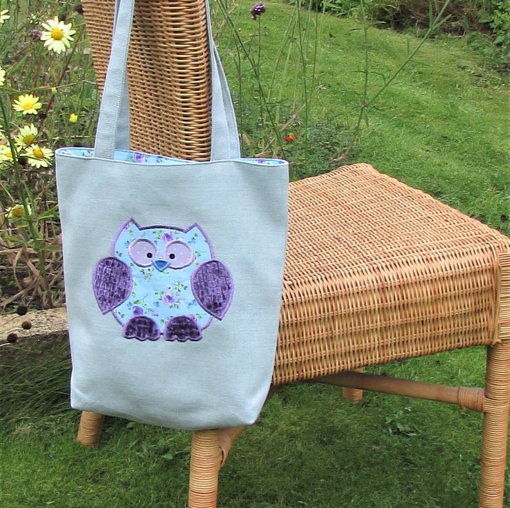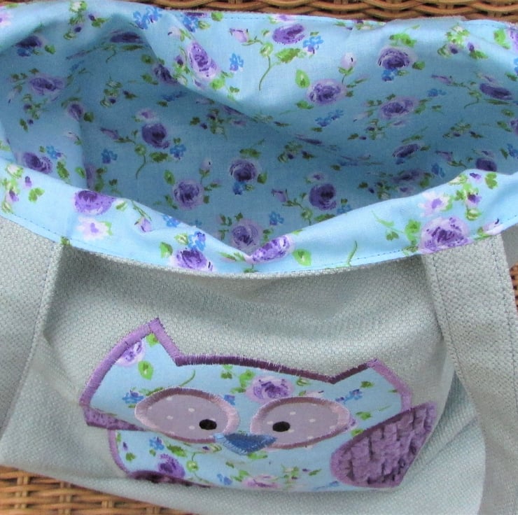 A pretty owl tote bag in pale blue fabric with a cute applique owl. The main body of the owl is made from a floral print fabric with purple flowers on a pale blue background. The wings and feet are a luxurious purple textured velvet with a raised pattern of little squares. The owl has a blue beak and eyes made from lilac fabric with white polka dots and embellished with black sequins. The bag is fully lined with floral fabric which matches the main body of the owl.