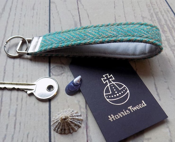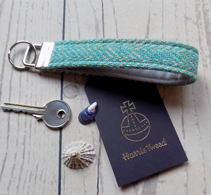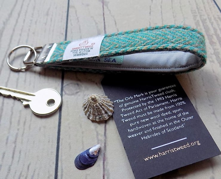 Key fob with Harris Tweed wrist strap: herringbone weave in turquoise green and beige. The strap has a sturdy metal bar with keyring attached to keep your keys secure and easy to find in your pocket or bag. Lined with stone coloured cotton. The woollen tweed fabric is hard wearing and dirt-resistant and can be spot-cleaned.