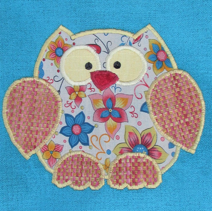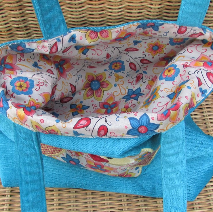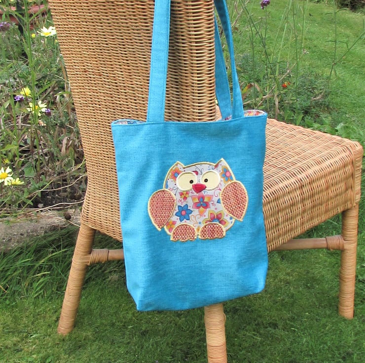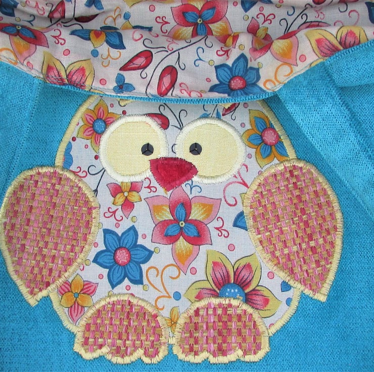 A striking owl tote bag in luxurious velvety turquoise fabric with a cute applique owl. The main body of the owl is made from a floral print fabric in shades of pink, turquoise and golden-yellow on a pale pink background. The wings and feet are woven fabric with shades of salmon pink and golden-yellow in the weave. The owl has a maroon beak and pale yellow eyes embellished with black sequins. The bag is fully lined with floral fabric which matches the main body of the owl.