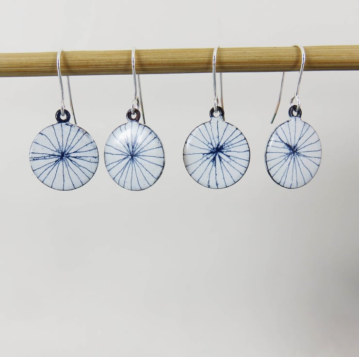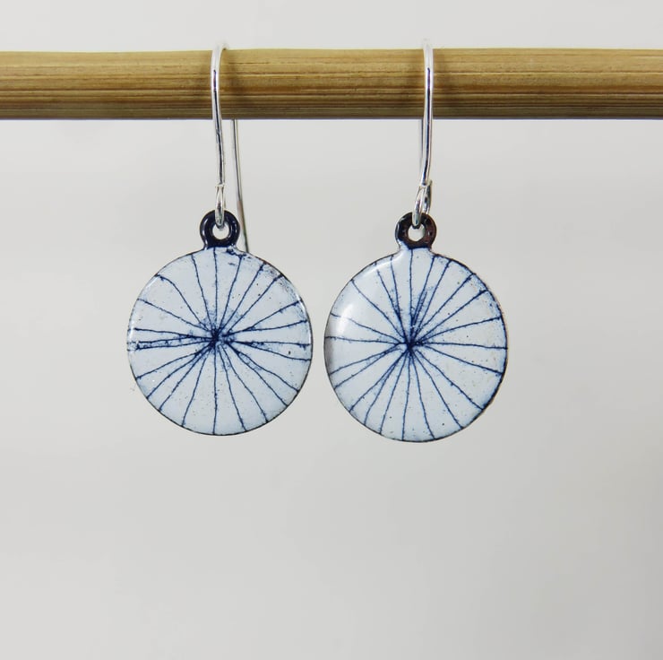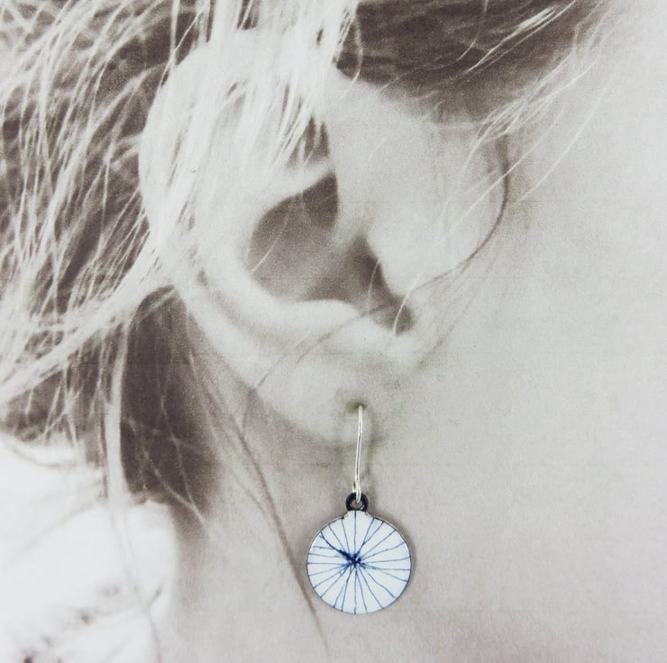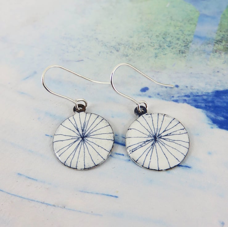 15mm circle copper dangle earrings decorated with a drawn starburst design in white and blue enamel. Hung on silver earring hooks for pierced ears. Fired in the kiln at 830 degrees.