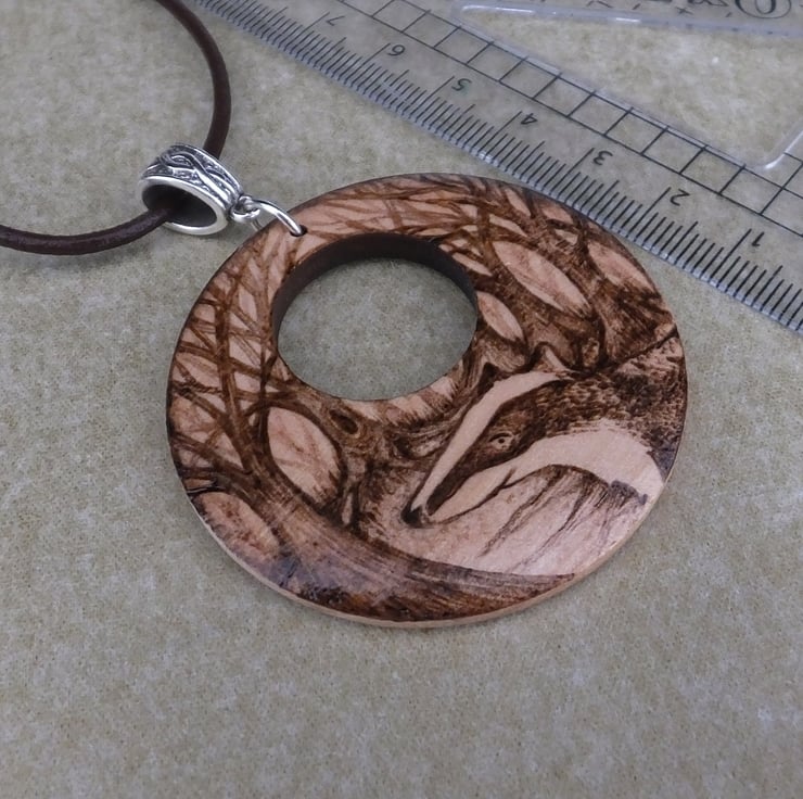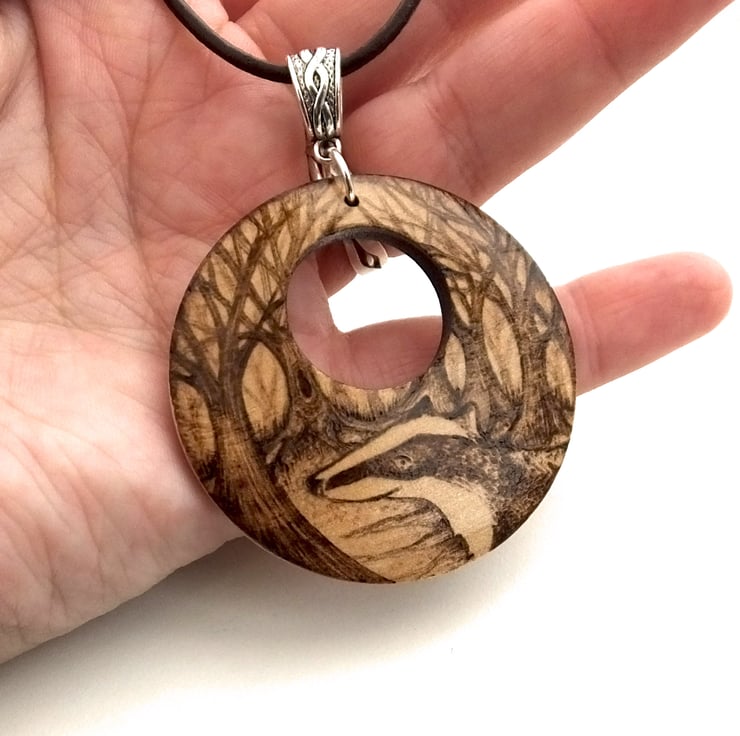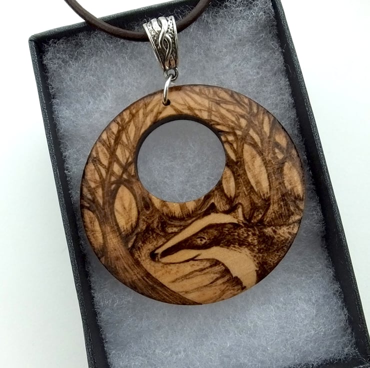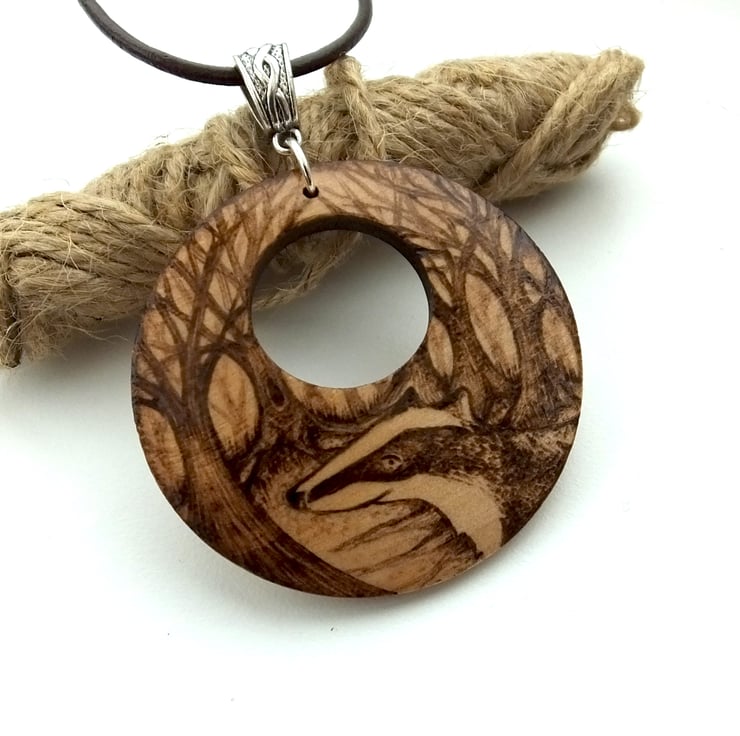A gorgeous wooden circular badger pendant, with him/her foraging in the woods amongst the roots and leaves . All hand burned using the art of pyrography. Perfect as a birthday, Christmas, or 5th (wood) anniversary gift.