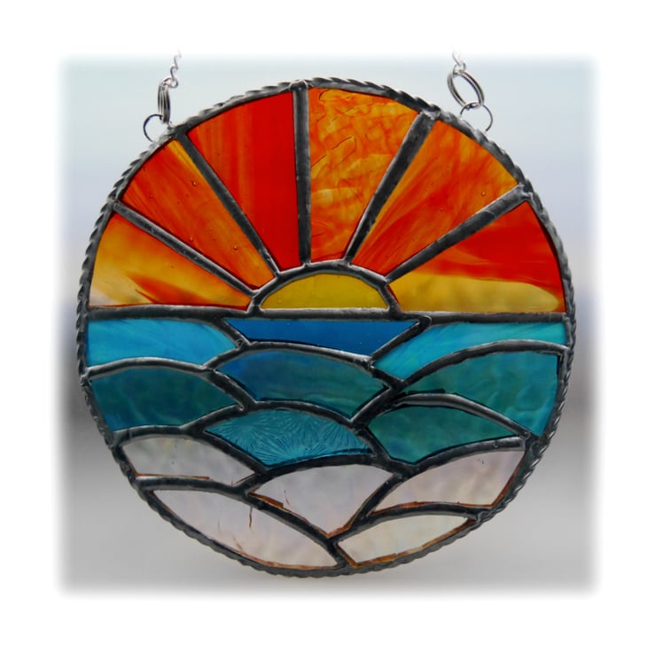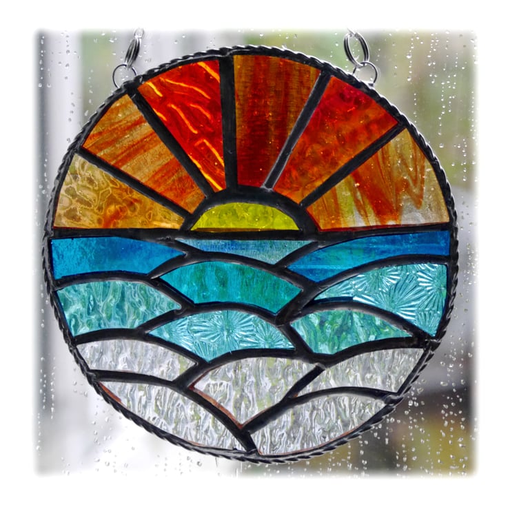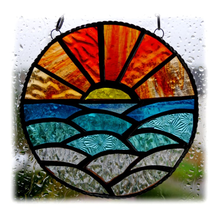 A round glass picture of a setting sun with 6 rays in shades of red, amber and orange above the bright yellow sun. The sea is made from curved waves of clear and turquoise, aquamarine glass. All different types, textured, iridescent to gives lots of movement.