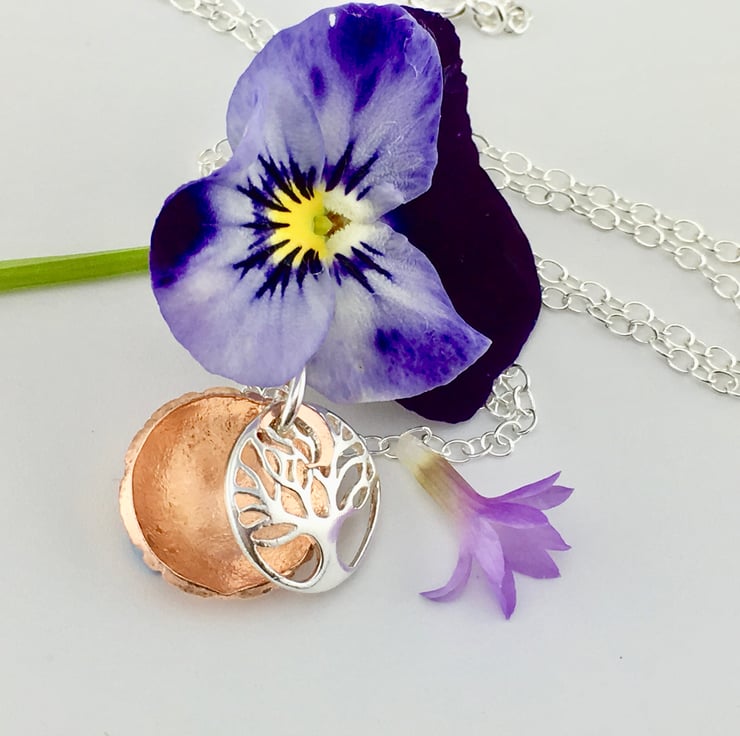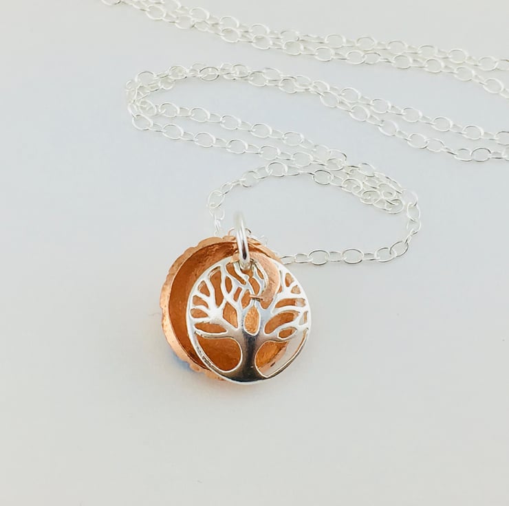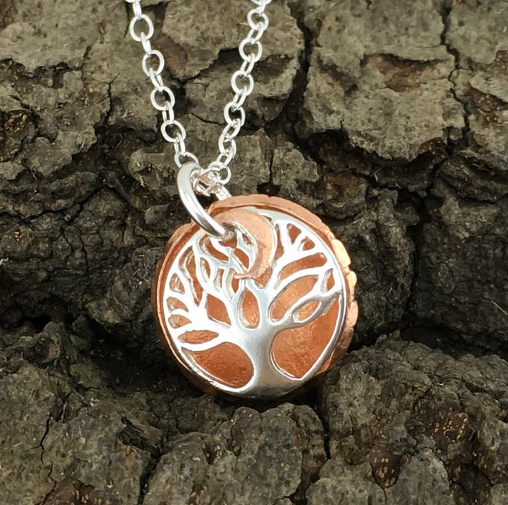 Silver Copper Tree of life Moon Pendant.