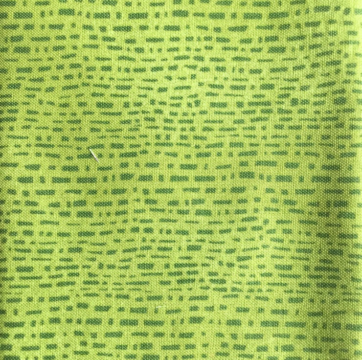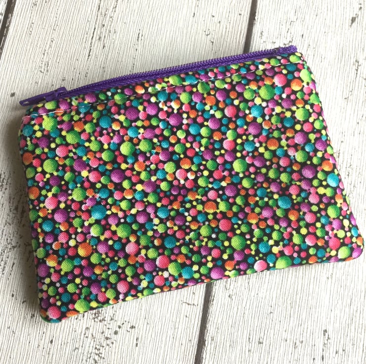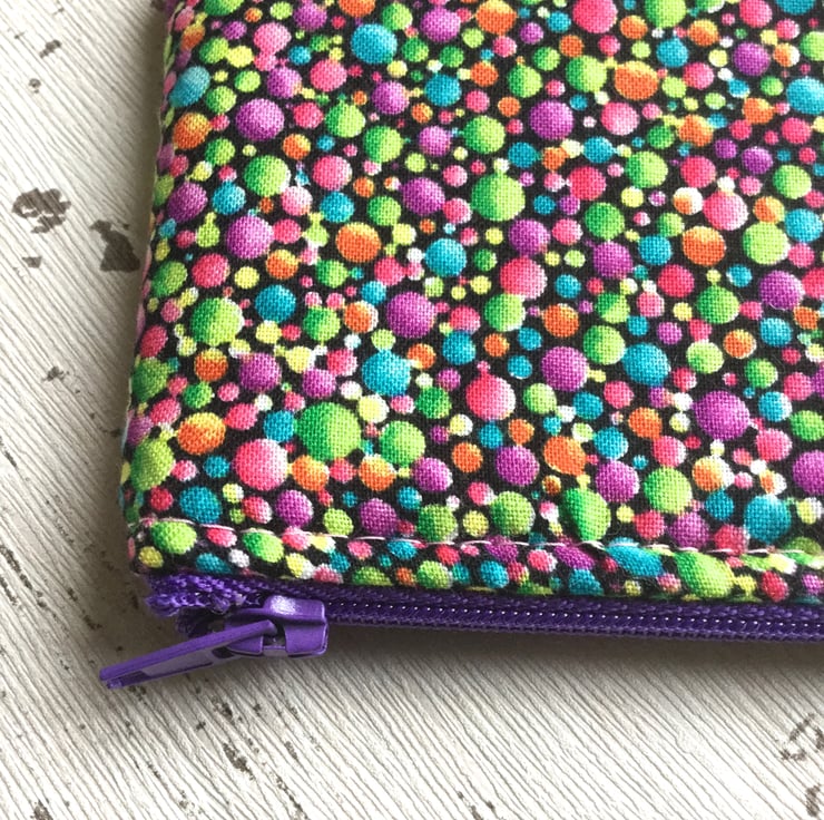 A purple zip and a lime green cotton lining with a darker green dash, dot print complete this look. Fleece interfacing gives a soft touch to this purse.