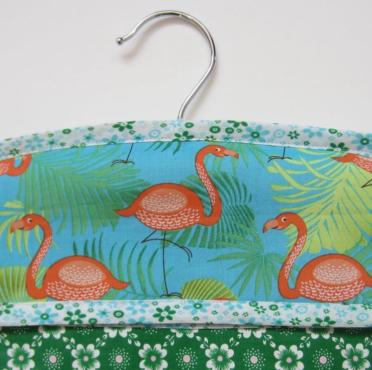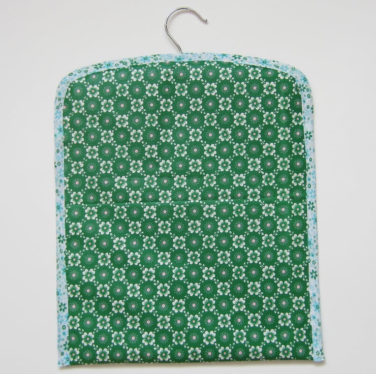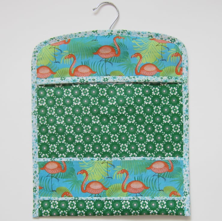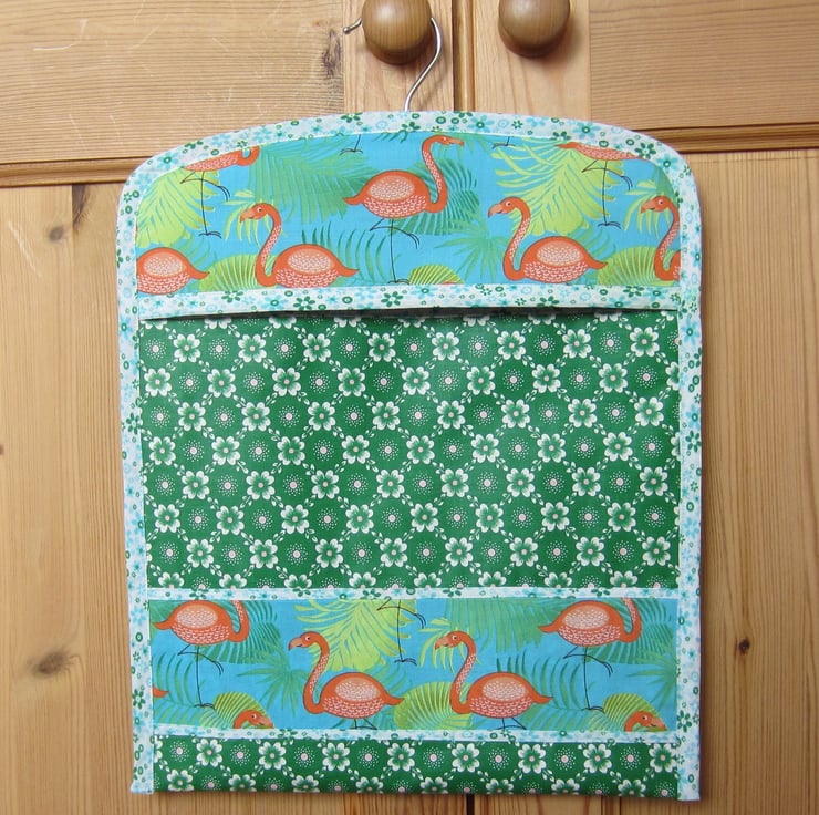 Sturdy peg bag made from unused vintage green floral fabric with flamingo panels. Edged in a pretty blue, green and white floral fabric and fully lined with a pale green fabric.