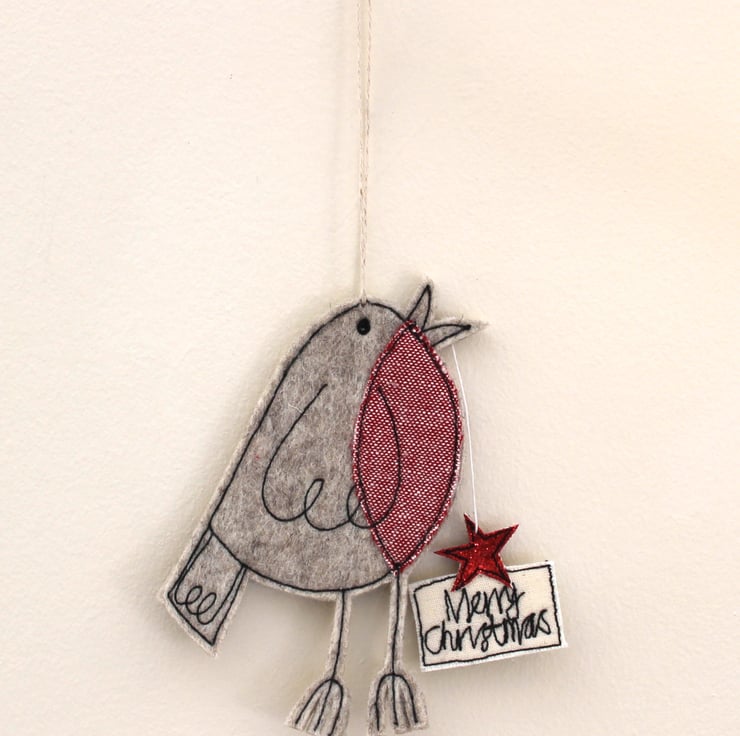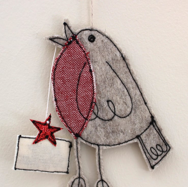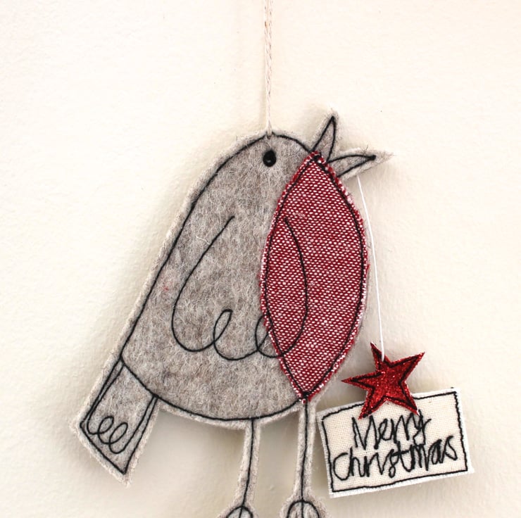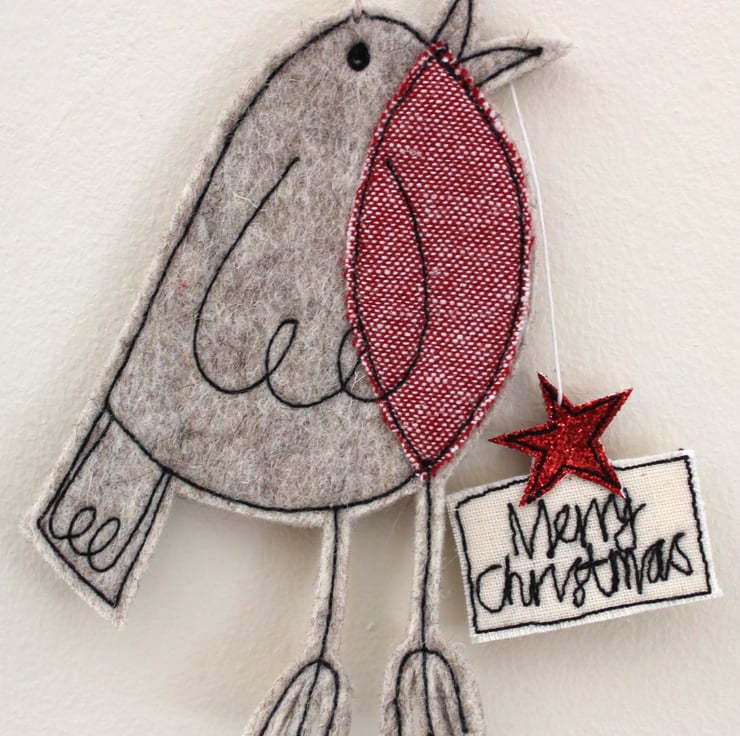 Mr Robin is created using 100% beige wool felt, red cotton fabric, red glitter fabric and free hand machine embroidery. Suspend him from your Christmas tree and he will make you smile.