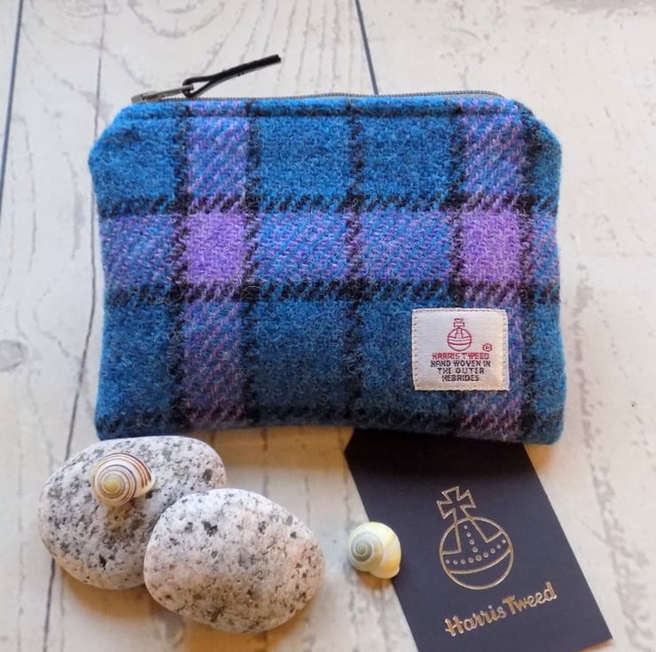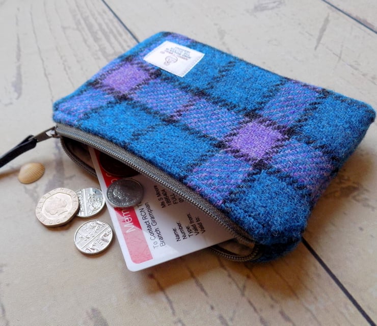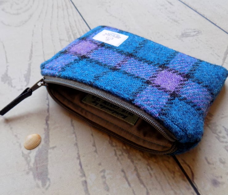 Harris Tweed coin purse/ small make-up bag/ gadget pouch. Check/plaid weave in deep turquoise, lilac and charcoal grey. It is lined with ash grey cotton fabric, with a grey zip and black leather zip pull. It has an internal divider pocket to the full width of the purse, which will easily fit your bank cards, coins/notes. The purse is also suitable as a small make-up bag, a large keys pouch, or a multitude of other uses for keeping things organised in your bag or pocket.