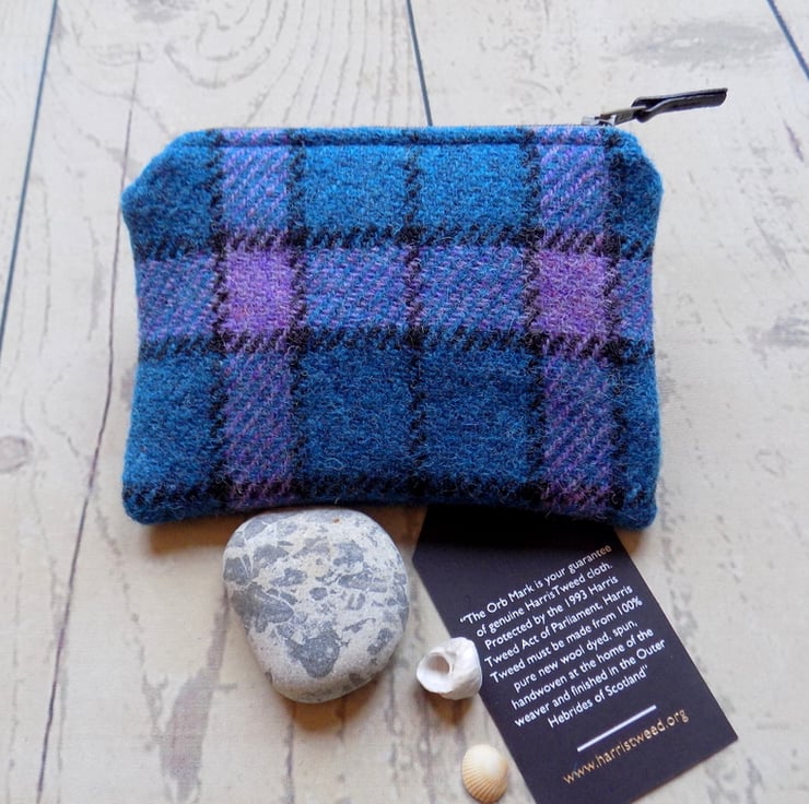 The purse carries the Harris Tweed label which authenticates the fabric as 100% pure new wool, hand woven at the home of the weaver in the Outer Hebrides of Scotland.