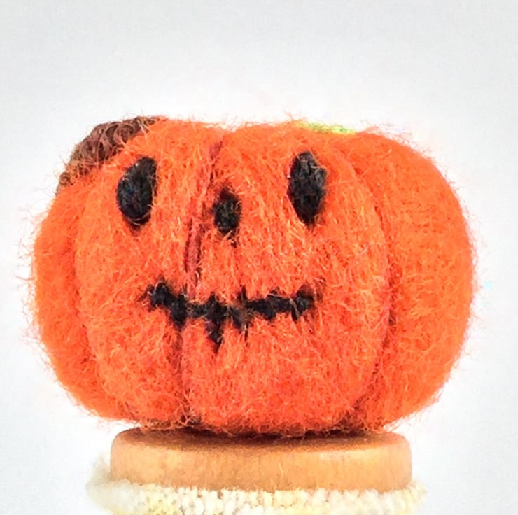 Two tiny textile treasures made using needle felt, fabric and hand embroidery. The orange needle felted pumpkin has hearts on one side and a spooky face on the other. The other has been made using check fabric with tiny cast on stitch leaves and stalk.