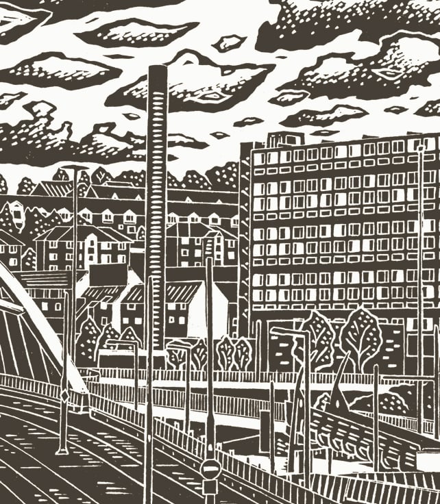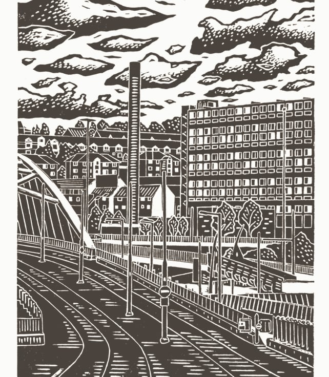 As with a few of my city views, it might not be the most obvious choice, but I was interested in the contrast in architecture, with the brutal concrete flats, the more suburban houses and the patterns of lamps, poles, bridges and iron-work.