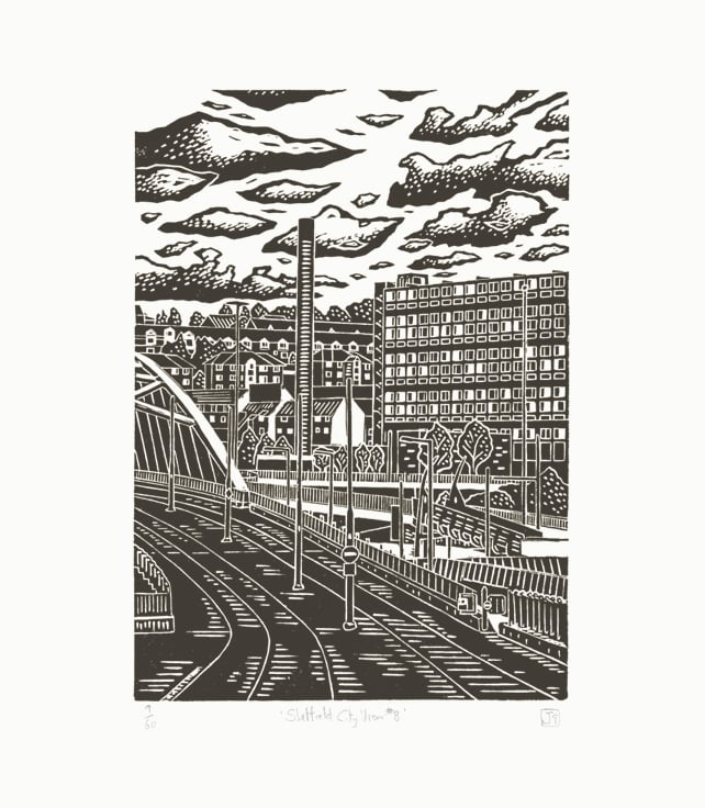 A3 (29.7cm x 42 cm) screen-print entitled 'Sheffield City View No.8' printed in warm grey.