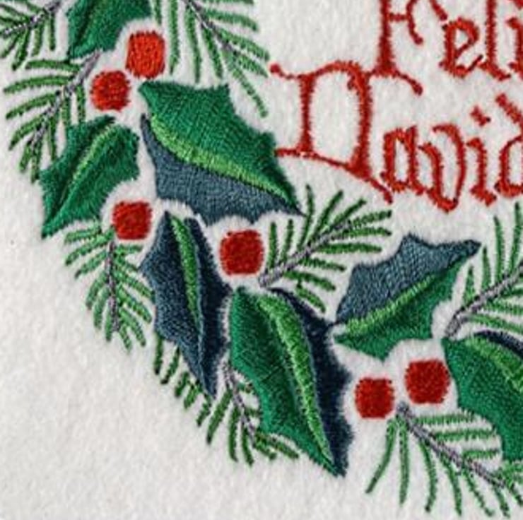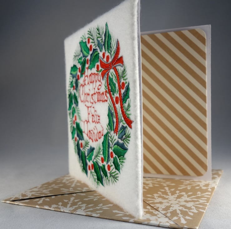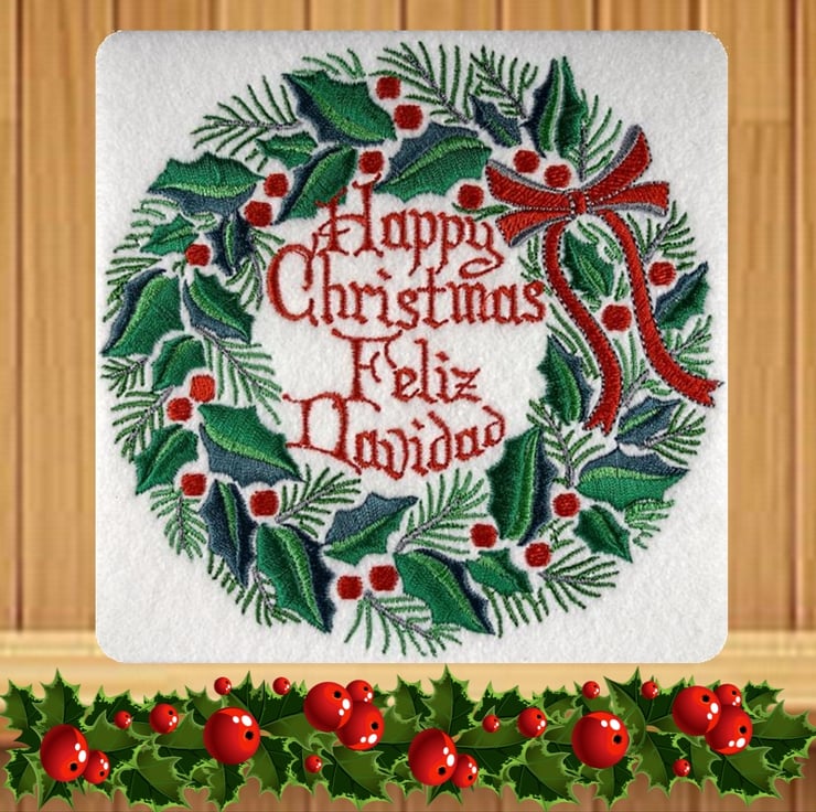 Spanish Handmade Feliz Navidad Holly Wreath Christmas card embroidered design with matching insert and envelope.