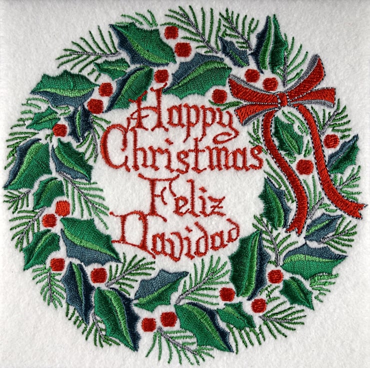 Spanish Handmade Feliz Navidad Holly Wreath Christmas card embroidered design made with love