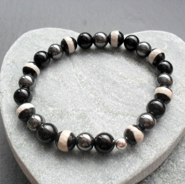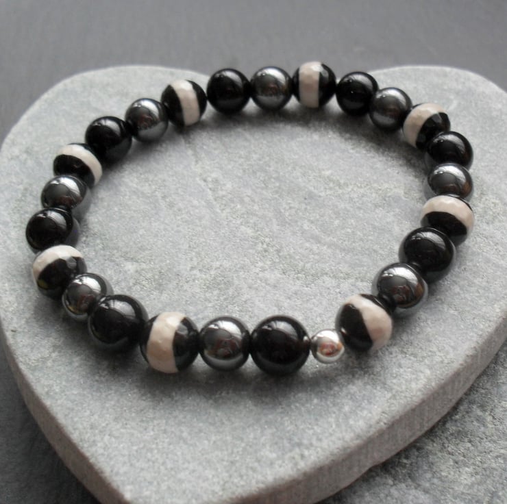 Black agate,haematite and agate beads which have a pattern design are beaded onto elastic .Bracelet has a sterling silver bead.