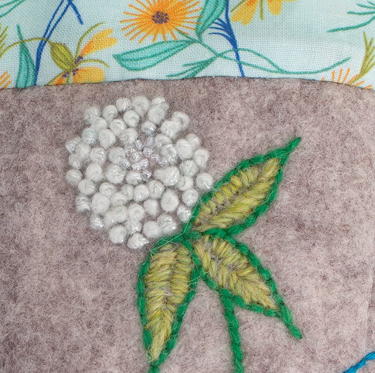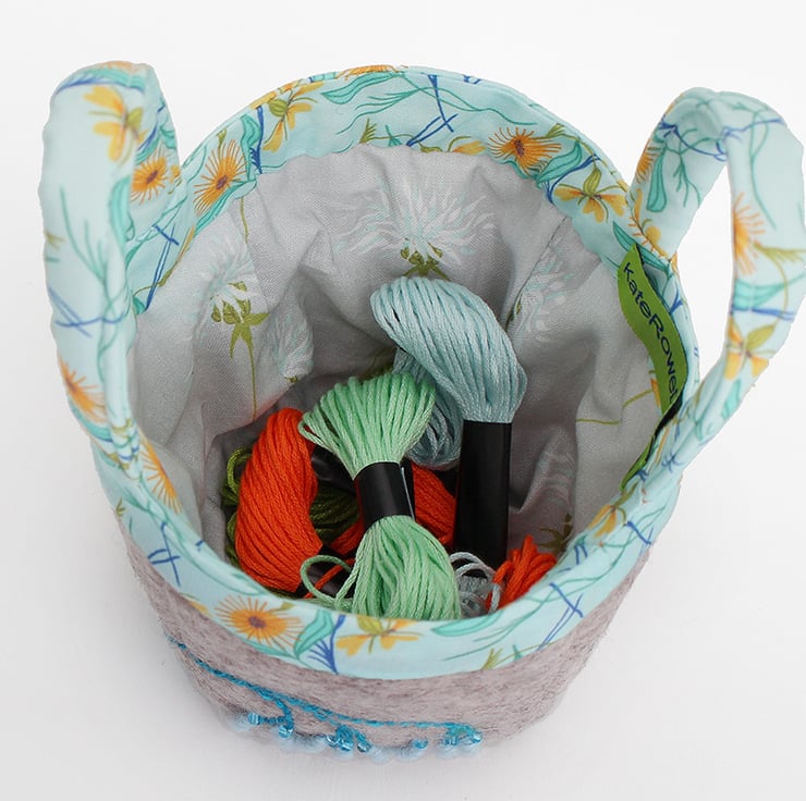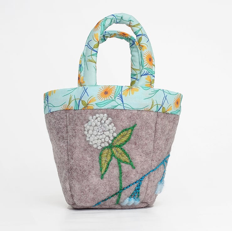 This is a very small project bag for little tiny items that you want to keep together and find easily as you work. It is made from grey wool felt and lined with my own grey thistle print and trimmed with my aqua marigold print(both cotton). I have hand hand embroidered a clover and bluebell flower onto the outer. The bag is bucket shaped to help you find your items quickly. The depth of the bag is 10.5cms(4 inches) and the base measures 7cms square (2.5 inches square)