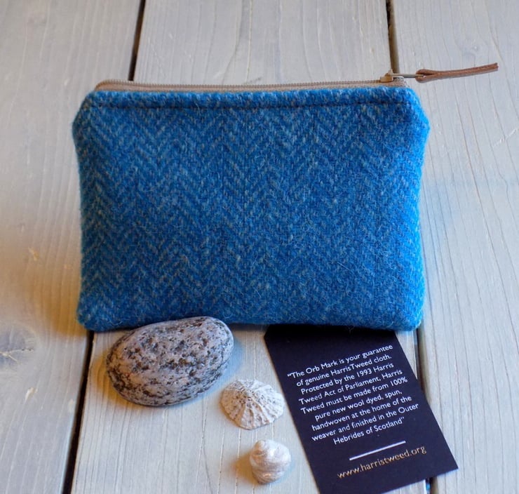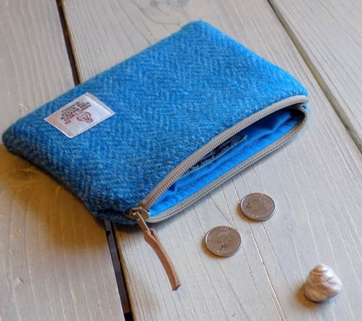 Harris Tweed large coin purse/ small make-up bag/ gadget pouch. Beautiful herrinbone weave in turquoise and light blue. It is lined with turquoise 100% cotton fabric, with a beige zip and natural leather zip pull. It has an internal divider pocket to the full width of the purse, which will easily fit your bank cards, coins/notes. The purse is also suitable as a small make-up bag, a large keys pouch, or a multitude of other uses for keeping things organised in your bag or pocket.