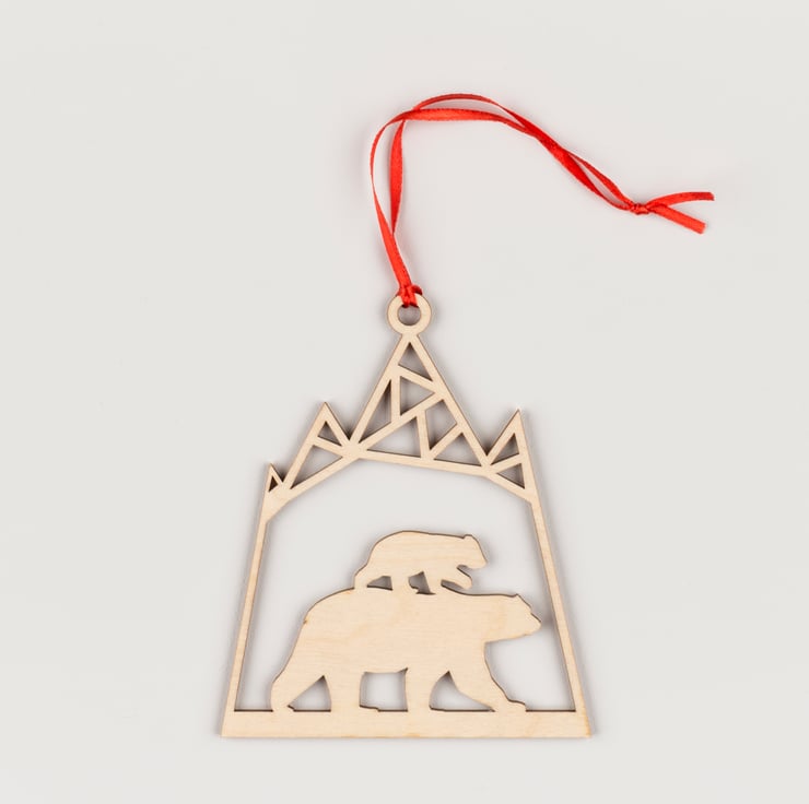 This wreath is designed by Beth from Boodle and laser cut in the UK. This polar bear silhouette is of a baby polar bear walking on the back of his mother polar bear within an ice mountain.