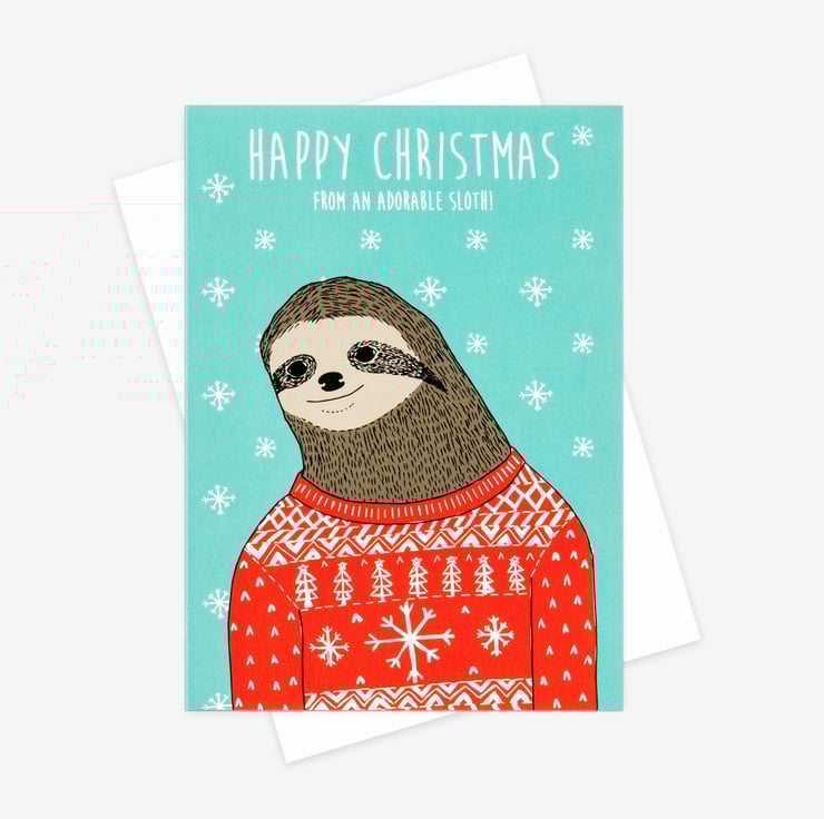 Originally drawn by hand, this illustration Features a sloth wearing his favourite Christmas sweater with the caption 'Happy Christmas from an adorable sloth'
