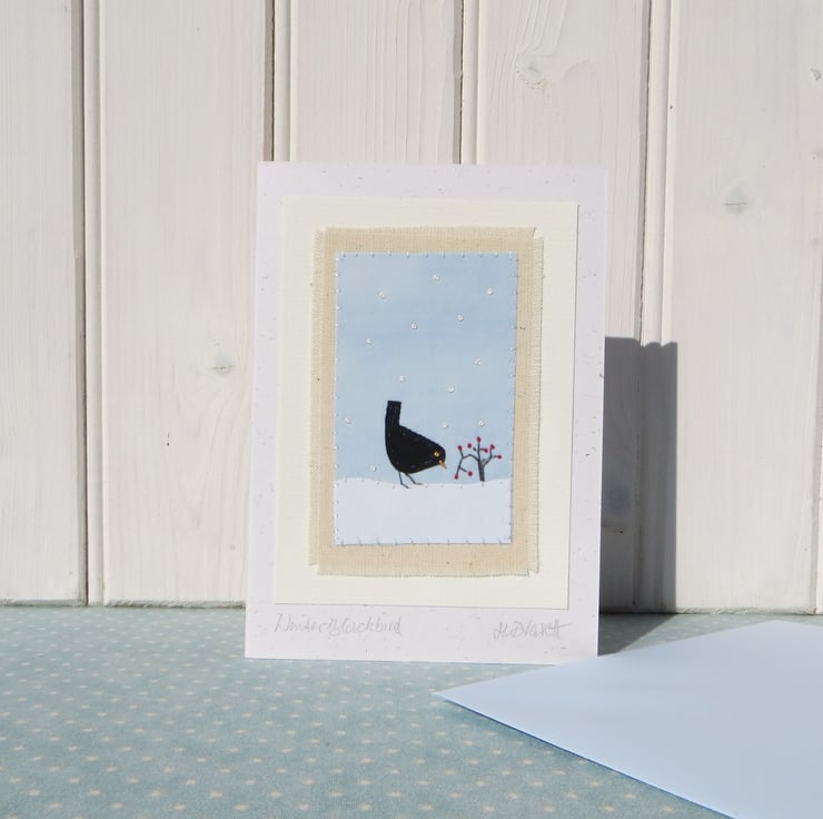 This is a small handmade greeting card featuring a miniature hand-stitched applique made using recycled hand-dyed cotton with intricate embroidered details. It is entitled 'Winter Blackbird' would be perfect for Christmas, but a winter birthday too, definitely a card to keep!