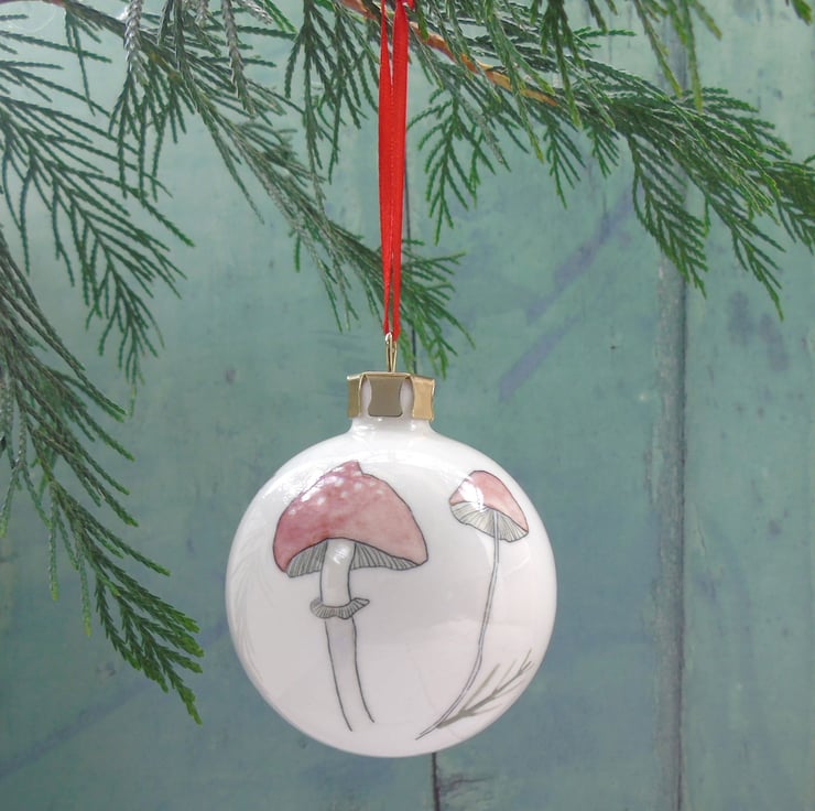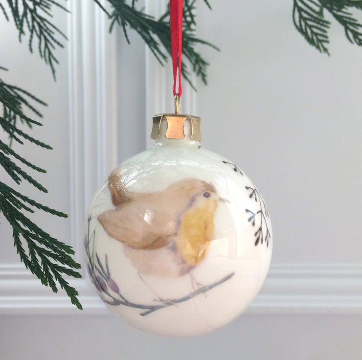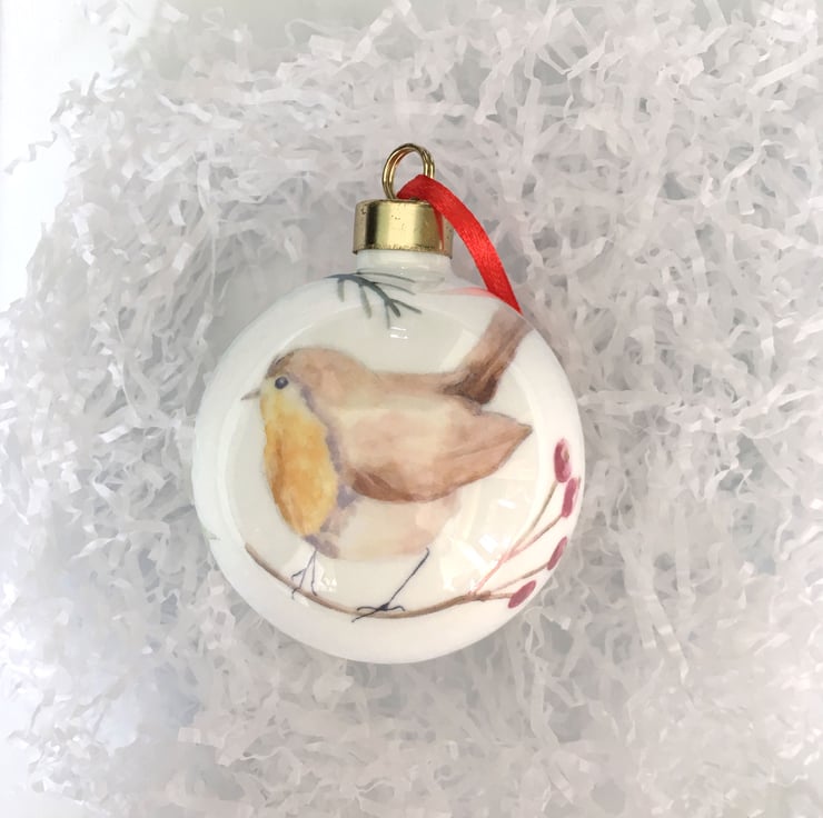 My watercolour paintings of a friendly robin printed as ceramic transfers and then hand cut and applied to a fine bone china Christmas tree bauble. Each bauble will have a different combination of imagery meaning each one is unique, creating a special heirloom decoration that can be treasured each year.