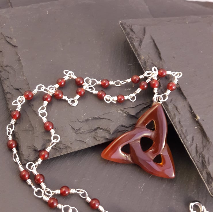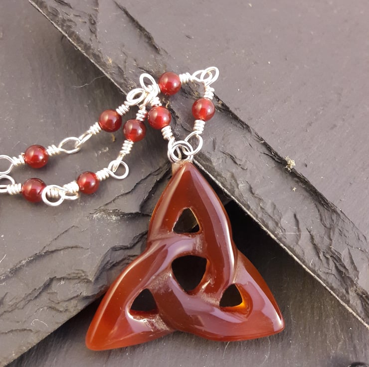 This gorgeous carved red agate triquerta is 3.7cm or 1.4in and hangs from rosary links of 4mm red agates and silver-plated copper wire, finished with a silver-plated lobster clasp. The necklace is up to 19.5in or 49.5cm, but the lobster clasp can be attached to the links to make is shorter. The wire has a hypo-allergenic coating that also helps prevent tarnishing.