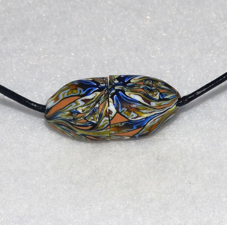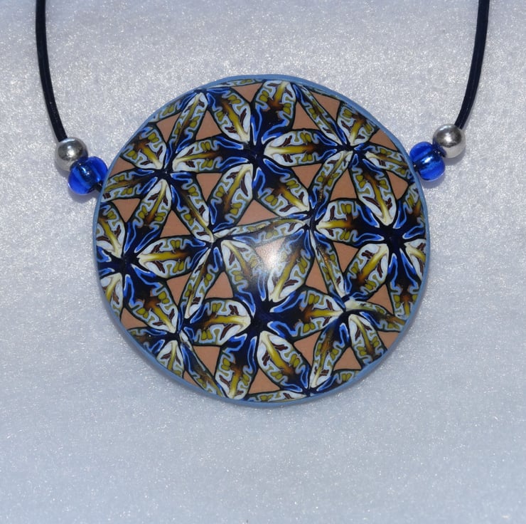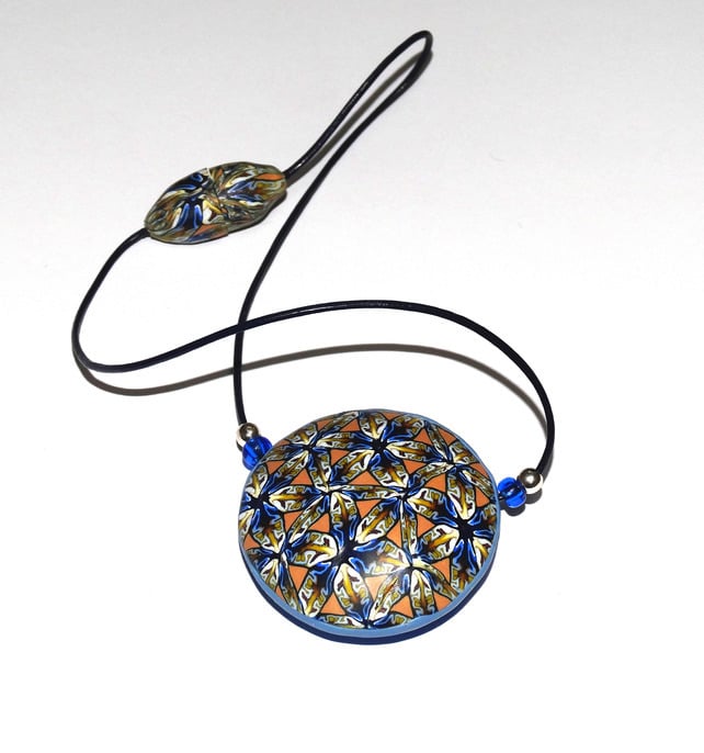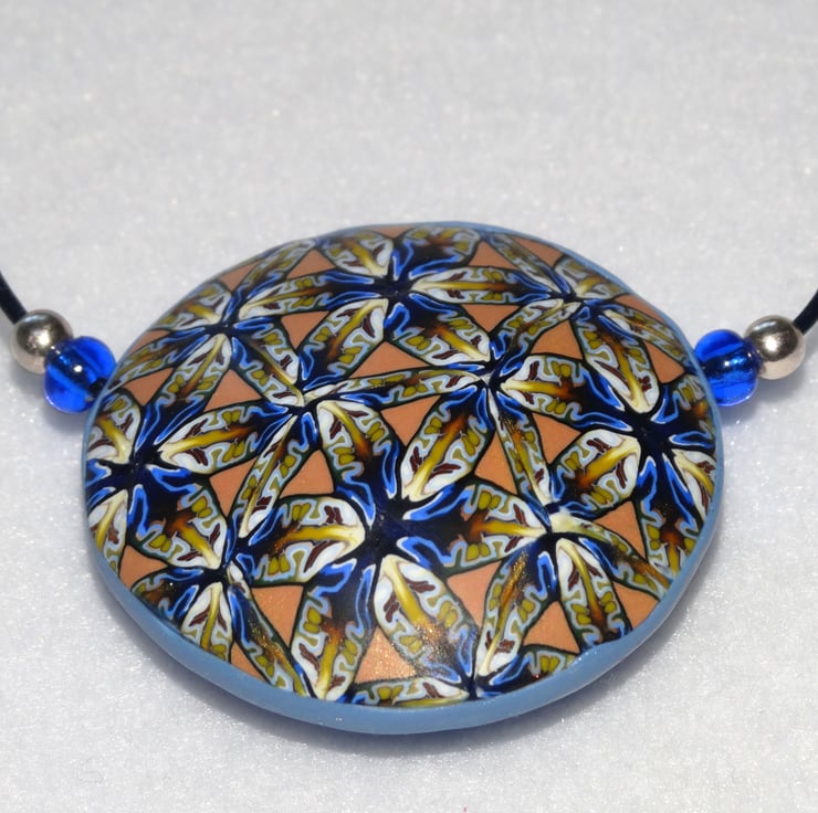 Attractively patterned hand made polymer clay pendant. The pendant is made from a lentil shaped bead. The front of the bead is made using a veneer constructed from slices of a unique kaleidoscope cane of polymer clay which I have made from a variety of colours and blends of raw clay, the back of the pendant is made from blue clay which has had a texture applied. The back and front are baked separately to harden the clay and then the pieces are joined and baked again. When the bead is finished the front is sanded and buffed to a shine.