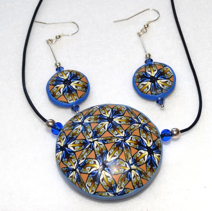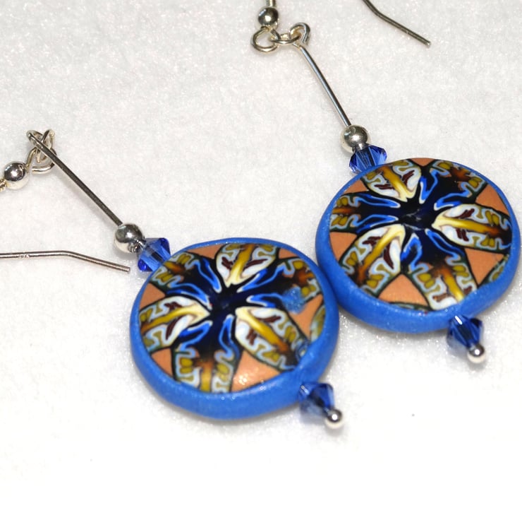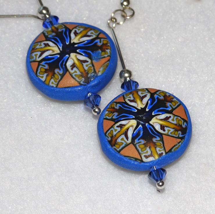 A beautiful pair of hanging earrings made using the same unique polymer clay kaleidoscope cane used for the Camilla pendant. The earrings are hand made by me using slices from a polymer clay cane that I have made using a variety of raw clay colours and blends. Slices of the cane are cut, re-cut to a circular shape and then baked to form a slight dome. Two pieces are then joined using blue clay and baked again.