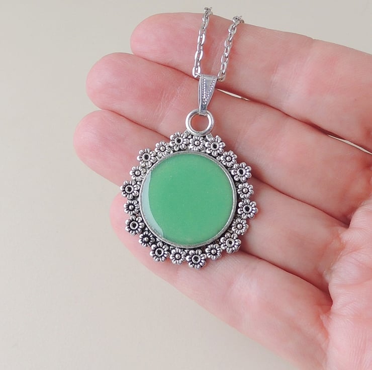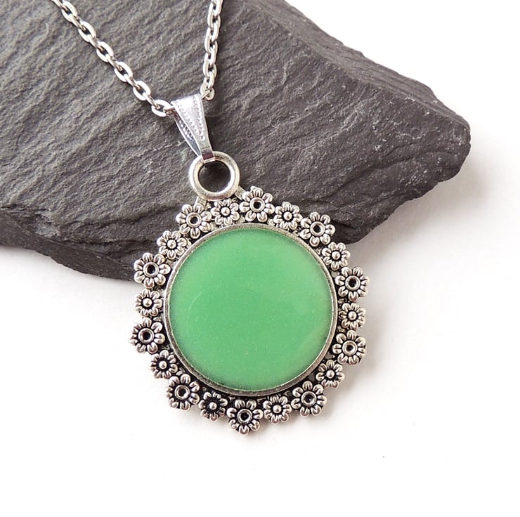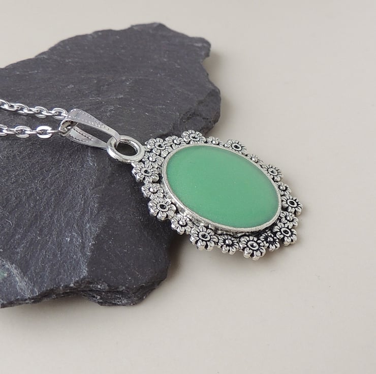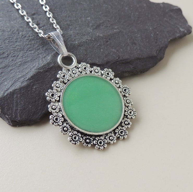 A pretty green and silver pendant necklace which comes on a 18 inch chain.