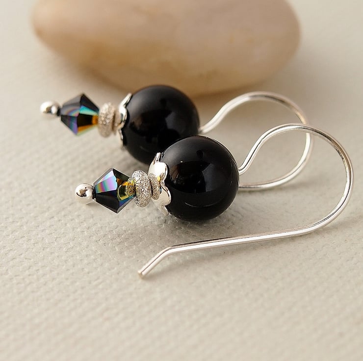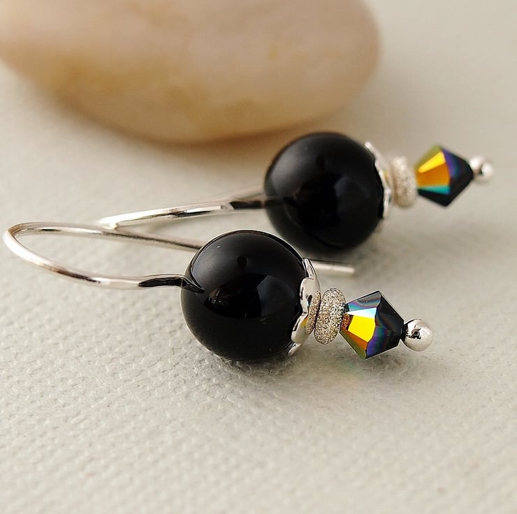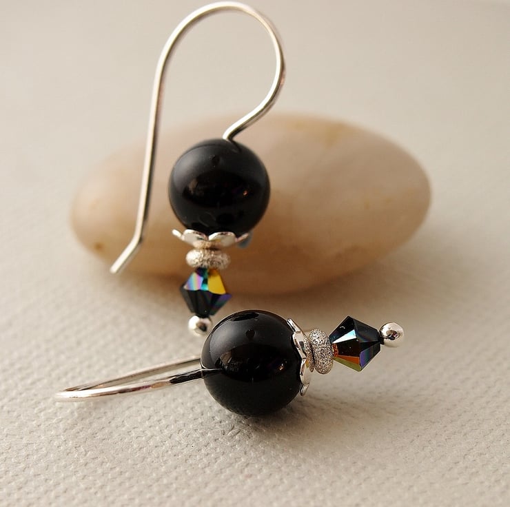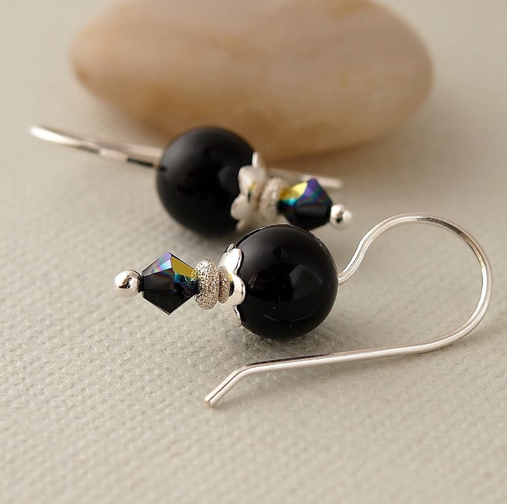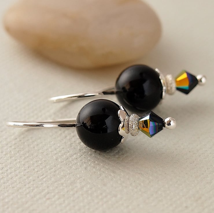 Pretty earrings hand forged using 20g silver wire on which have been threaded a Swarovski crystal glass pearl nestled in a sterling silver daisy beadcap and a sterling silver frosted bead with a Swarovski crystal bicone in Jet Black with a partial AB costing.