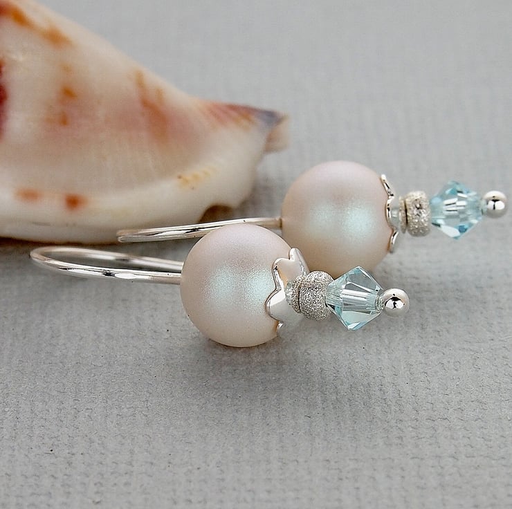 Gorgeous earrings hand forged using 20g silver wire on which have been threaded a Swarovski crystal glass pearl which sits in a sterling silver daisy beadcap with a sterling silver frosted bead and a Swarovski crystal bicone in Light Azure Blue.