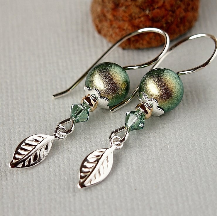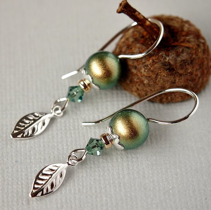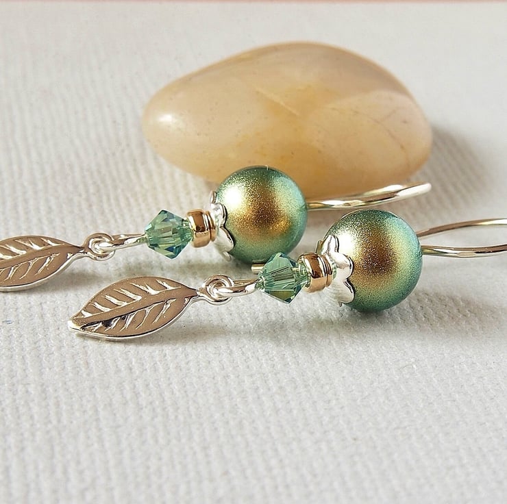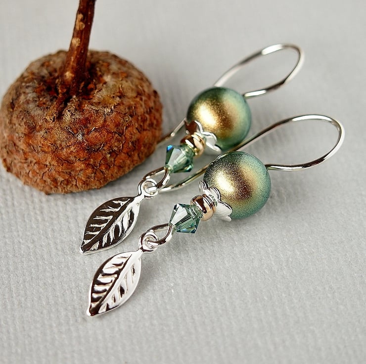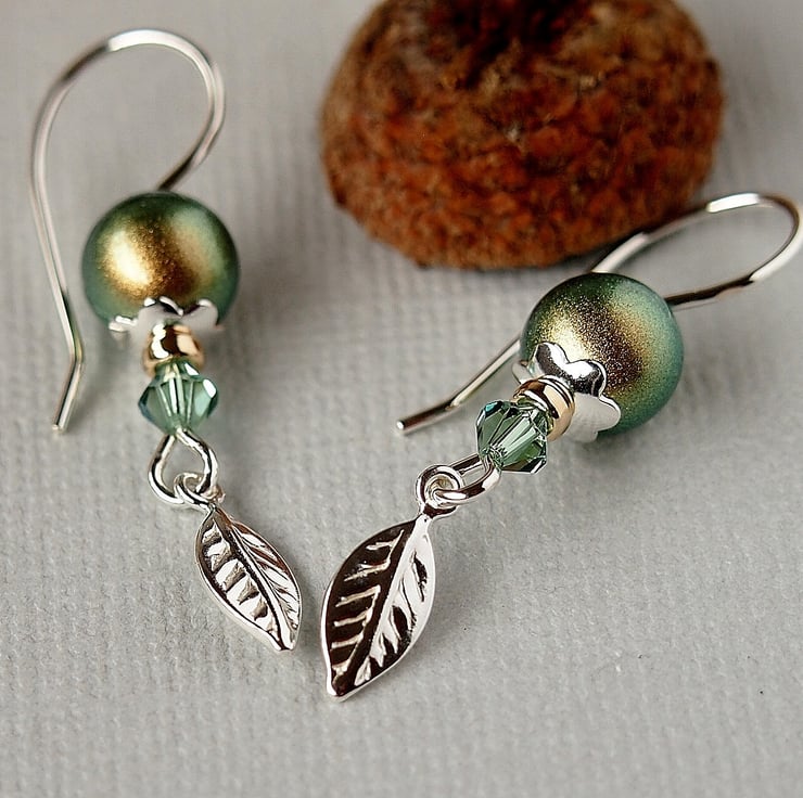 Pretty earrings hand forged using 20g silver wire on which have been threaded a Swarovski crystal glass pearl sitting in a sterling silver daisy beadcap with a gold filled bead and a Swarovski crystal bicone in Erinite, finished with a lovely sterling silver leaf charm.