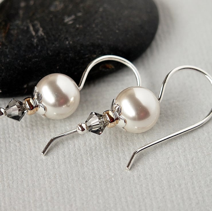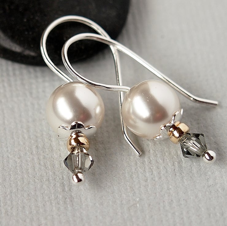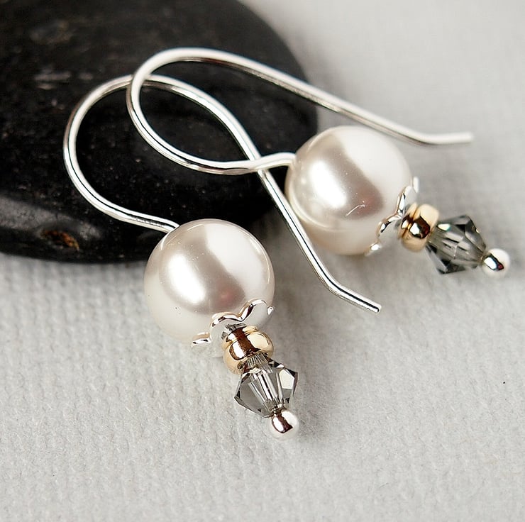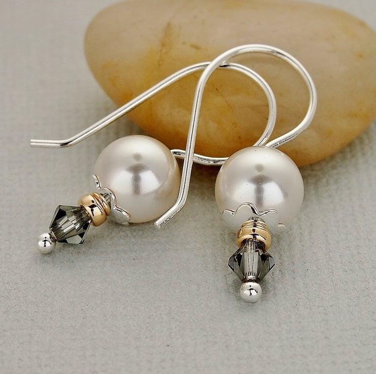 These dainty earrings have been forged using 20g silver wire on which have been threaded a Swarovski crystal glass pearl nestled in a sterling silver daisy beadcap and a gold filled bead with a Swarovski crystal bicone in Black Diamond.