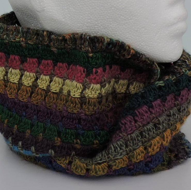 Colourful infinity scarf which I've crocheted in a double knit acrylic and wool multi tonal yarn. Dusky Heritage colours of green, blues, brown, mustard, pink and aubergine.