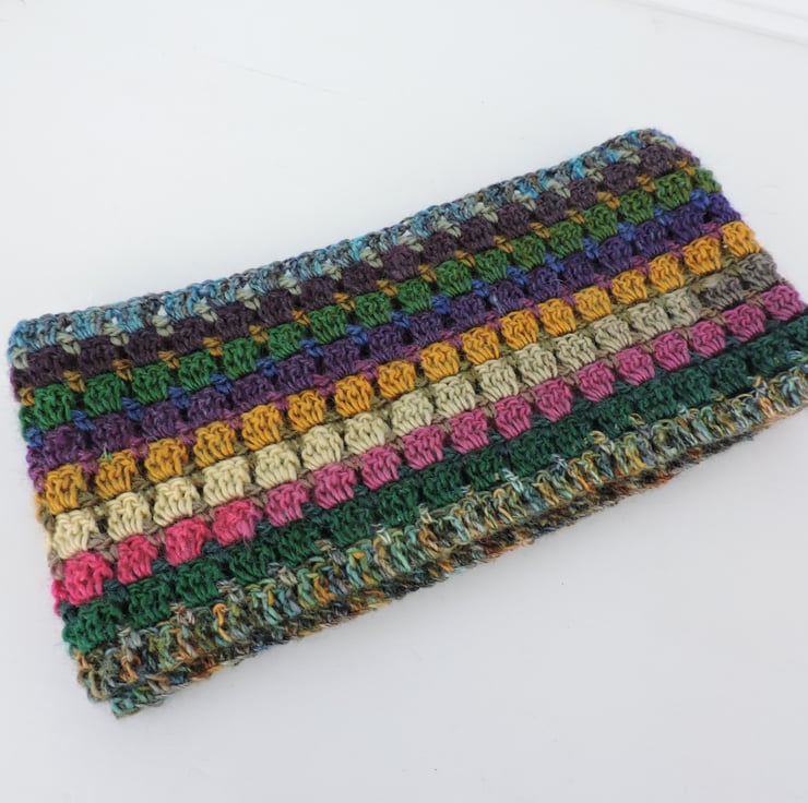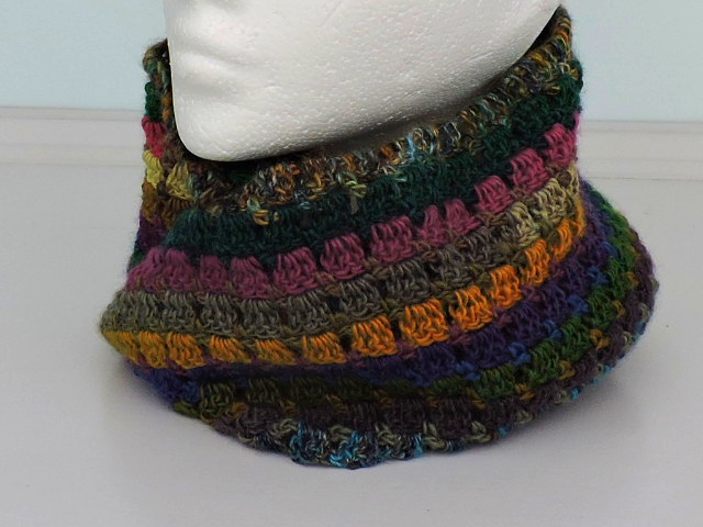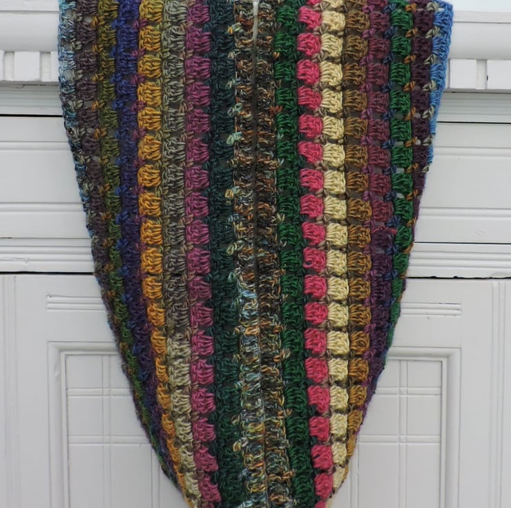 Colourful infinity scarf which I've crocheted in a double knit acrylic and wool multi tonal yarn. Dusky Heritage colours of green, blues, brown, mustard, pink and aubergine.
