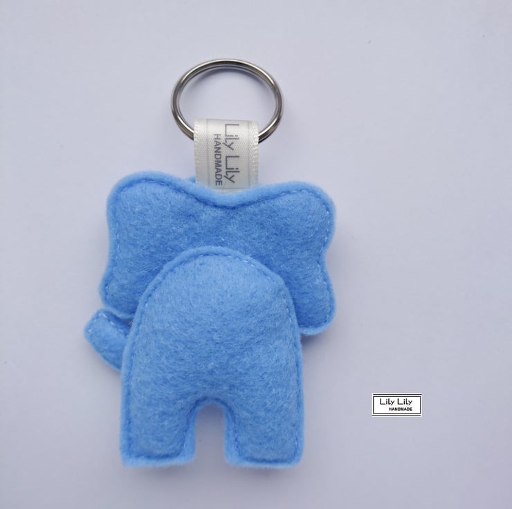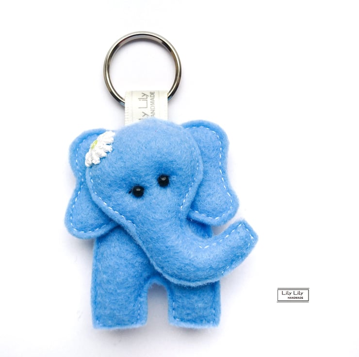 A cute elephant keyring designed and handcrafted by Lily Lily Handmade. The elephant key ring (key charm, key fob, bag charm) is sewn using felt and is slightly padded for a cute 3D effect. The elephant is embellished with a white flower. The silver hoop ring, measuring 1 inch in diameter, is secured with a ribbon loop.