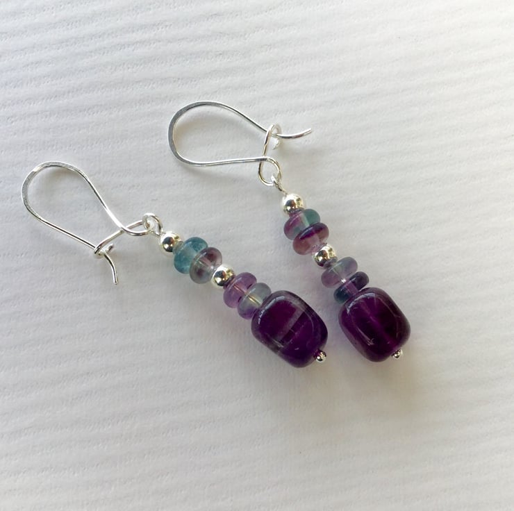 These beautiful dangly drop earrings feature deep purple amethyst nuggets with sterling silver beads and rainbow fluorite rondelles in soft heather shades of lavender and blue-green. Amethyst is a February birthstone. The earrings swing freely as you move around and the silver beads catch the light and add sparkle to the gemstones. The head pins are of sterling silver, as are the elegant beaded ear hooks. If you would prefer hand made safety hooks, shown in some of the photos, just add a note to your order. There is a matching necklace available from my Folksy shop. They are listed separately but I will apply a 10% discount if you buy the two together.