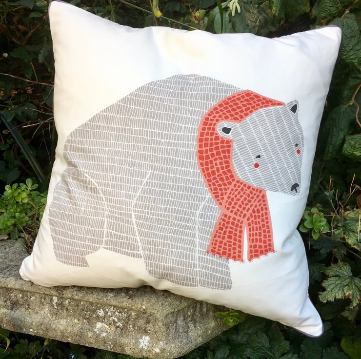 Polar Bear scatter cushion. A festive Christmas pillow with a scarf wearing polar bear on the front of the cushion. The back of the cushion is in a soft touch flannel fabric in a soft grey and has a central zip closure and makers label. It has been finished with elephant grey piped edging.
