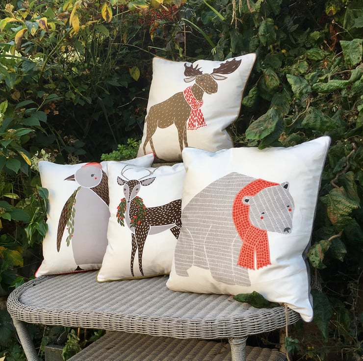 This cushion adds instant festive charm and colour. It is one of four of a collection of festive animals. The other cushions can be found in my shop.