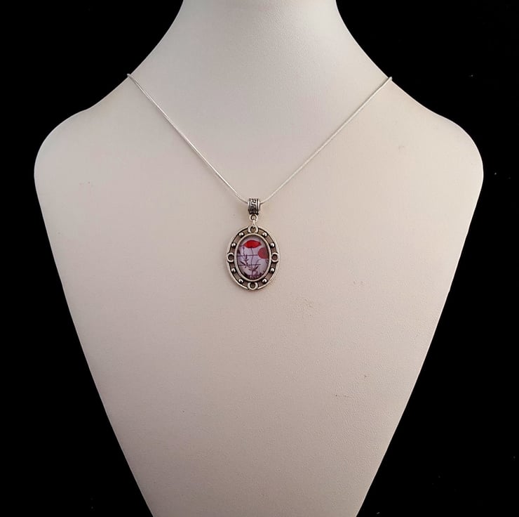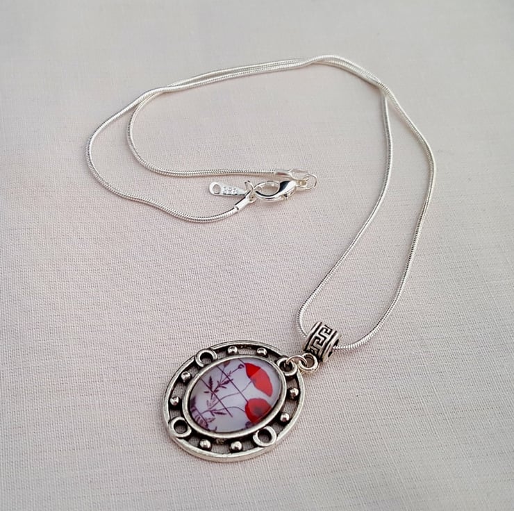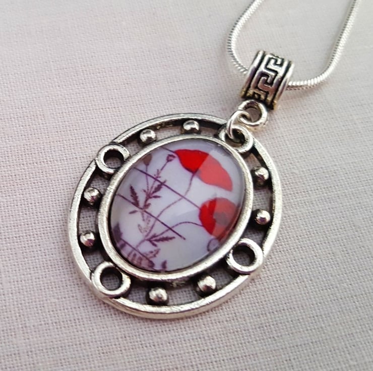 13 x 18mm glass poppy cabochon in Tibetan silver setting on 16" silver plated chain.