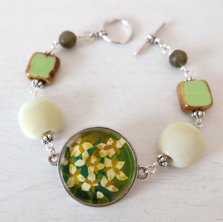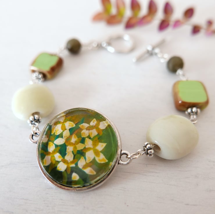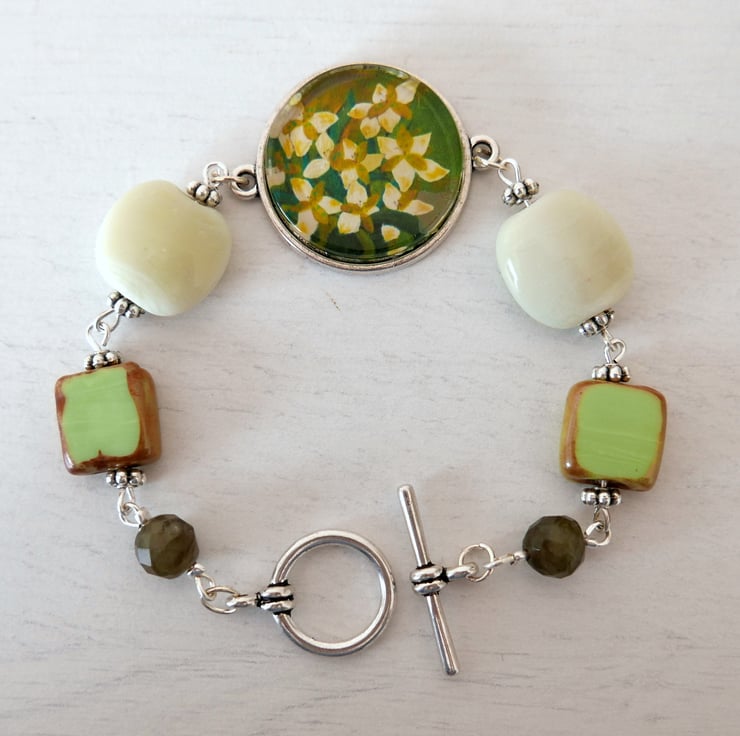 In making this bracelet, I used a pendant connector with a print after my original floral painting 'Peruvian Lillies'. The image is sealed under a 1" flat round cabochon and glued onto the antique silver setting. I also used two pale green glass beads, two lime green square glass beads, two green-grey labradorite faceted beads and floral spacer beads. The bracelet is approx 7.80" long and it fastens with a toggle clasp.