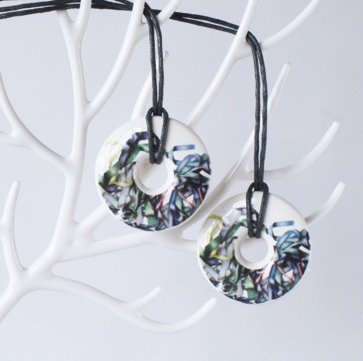 Tousled Ribbon Pattern Donut Shaped Ceramic Pendant on Grey Cord with Clasp
