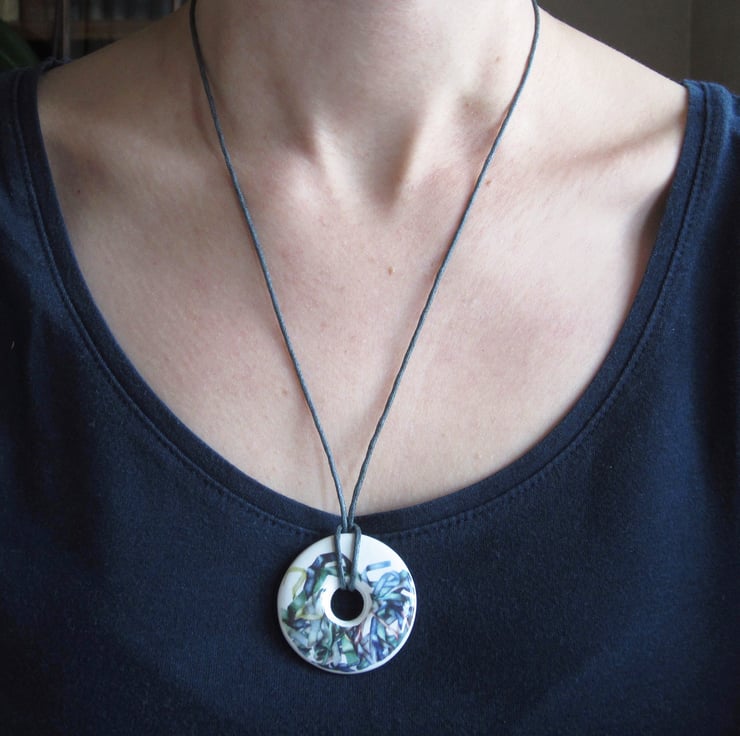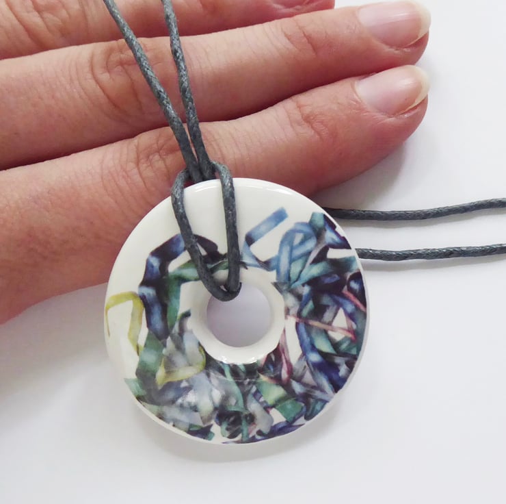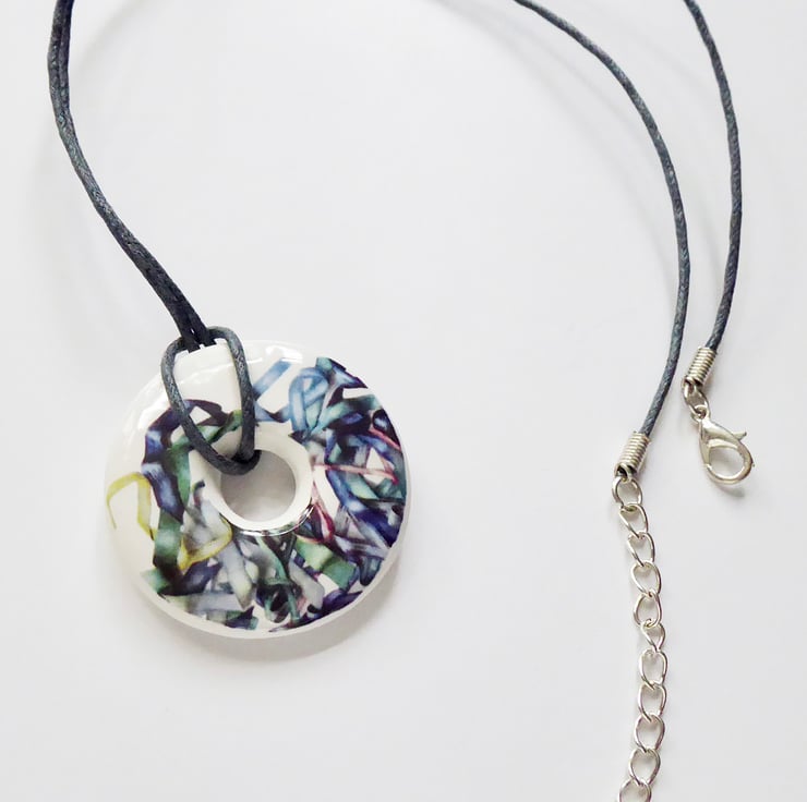 Tousled Ribbon Pattern Donut Shaped Ceramic Pendant on 50 - 55cm or 20 - 22 inch Grey Cord with Lobster Clasp and Extender Chain