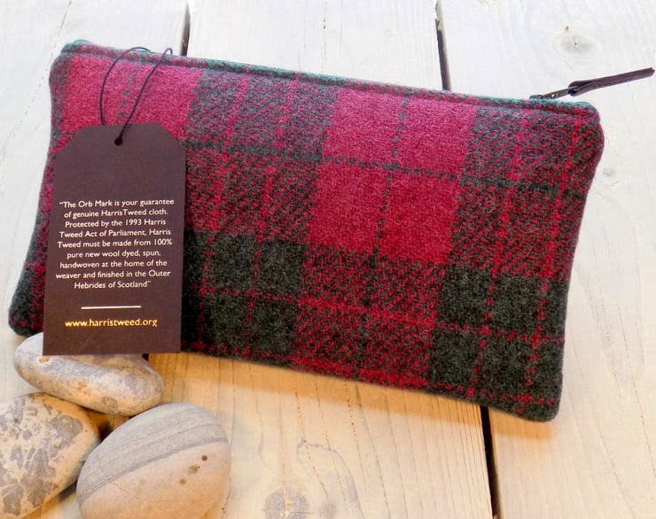 The pouch carries the Harris Tweed label which authenticates the fabric as pure new wool, hand woven in the Outer Hebrides of Scotland.