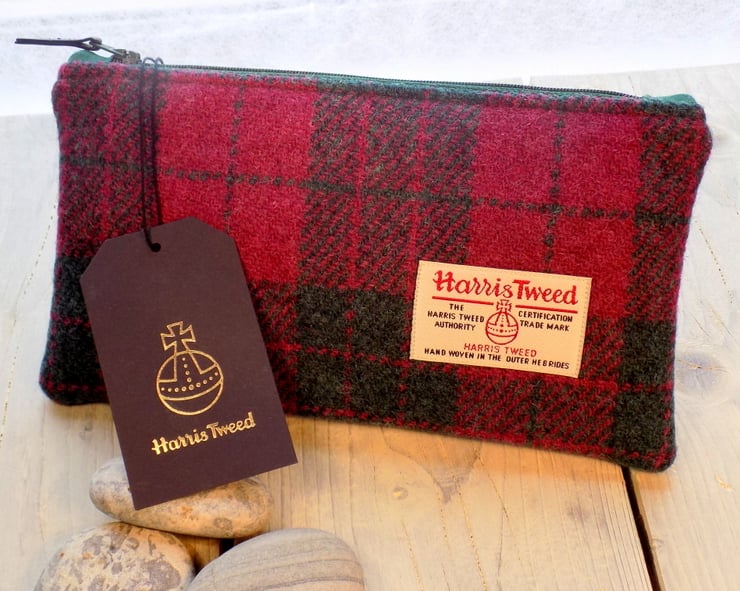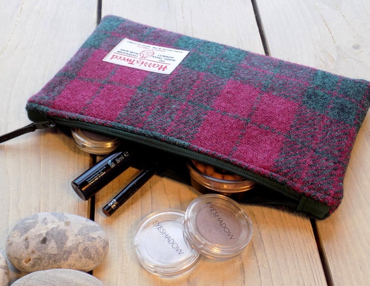 Harris Tweed clutch purse/zipper pouch. Can be used as a makeup bag, a pencil case, or an elegant clutch for a night out. Tartan weave in cranberry red and forest green. It is padded, has a bottle green zip with black leather zip pull and bottle green cotton lining. Alternatively, a wipe-clean water-resistant lining fabric is available in bottle green, navy blue or black - just send me a message with your order. Equally, if you would prefer a different colour zip or lining, send a message when you order.