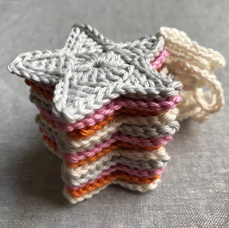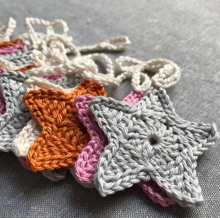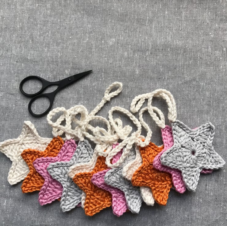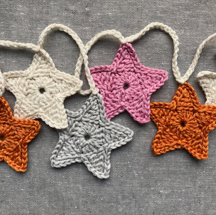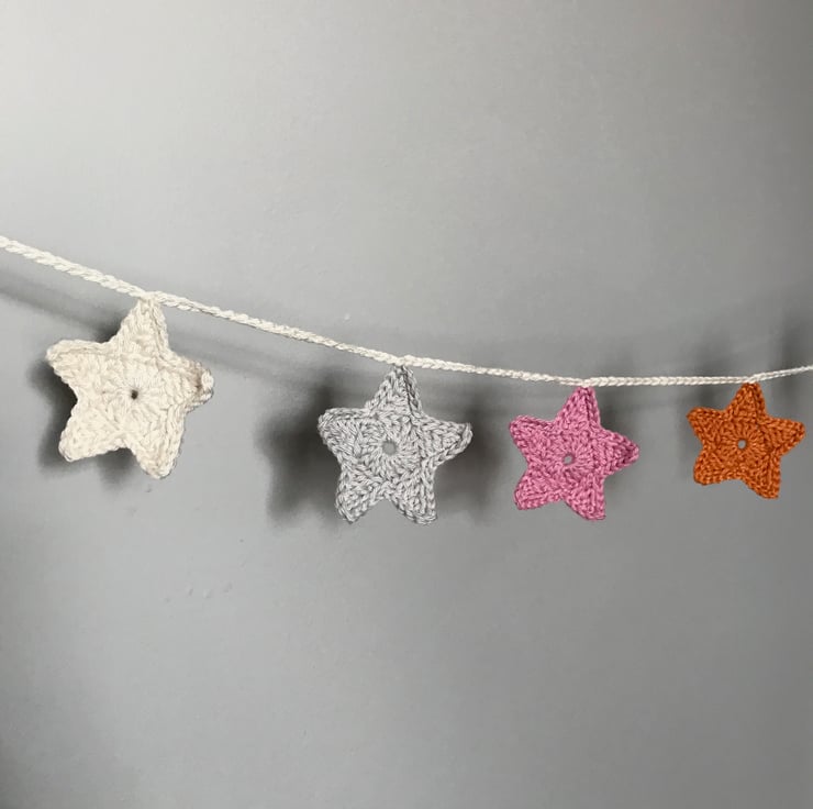 Super cute little stars made from lovely 100% cotton, hand crocheted and strung together to hang on the wall. In a modern and feminine colour way, it will look at home on the wall of a little girls bedroom, or a cozy living room.